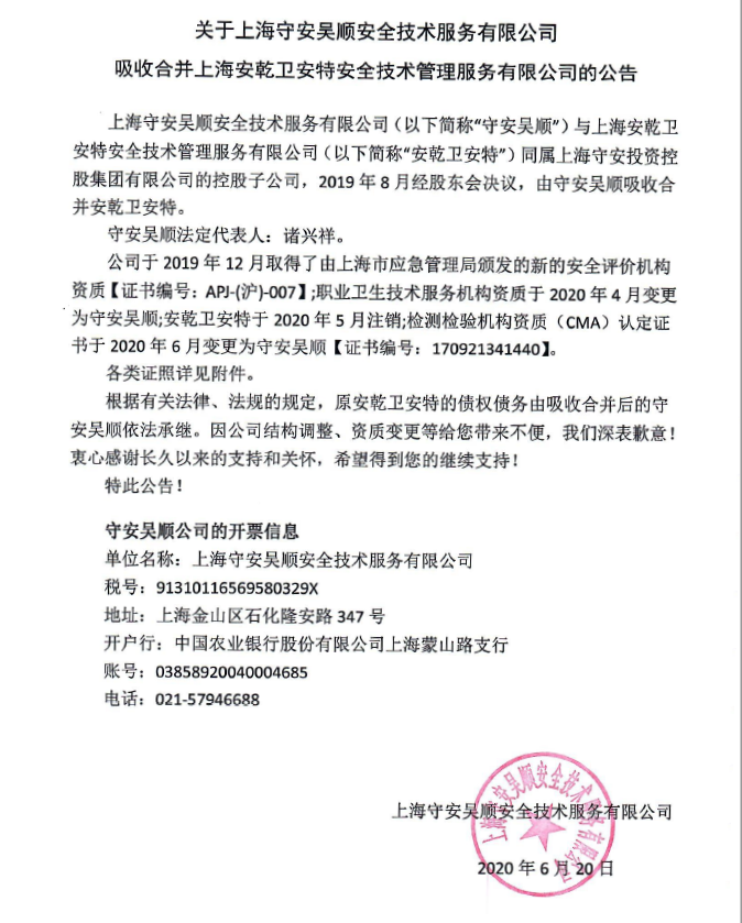 关于上海守安吴顺安全技术服务有限公司吸收合并上海安乾卫安特安全技术管理服务有限公司公告