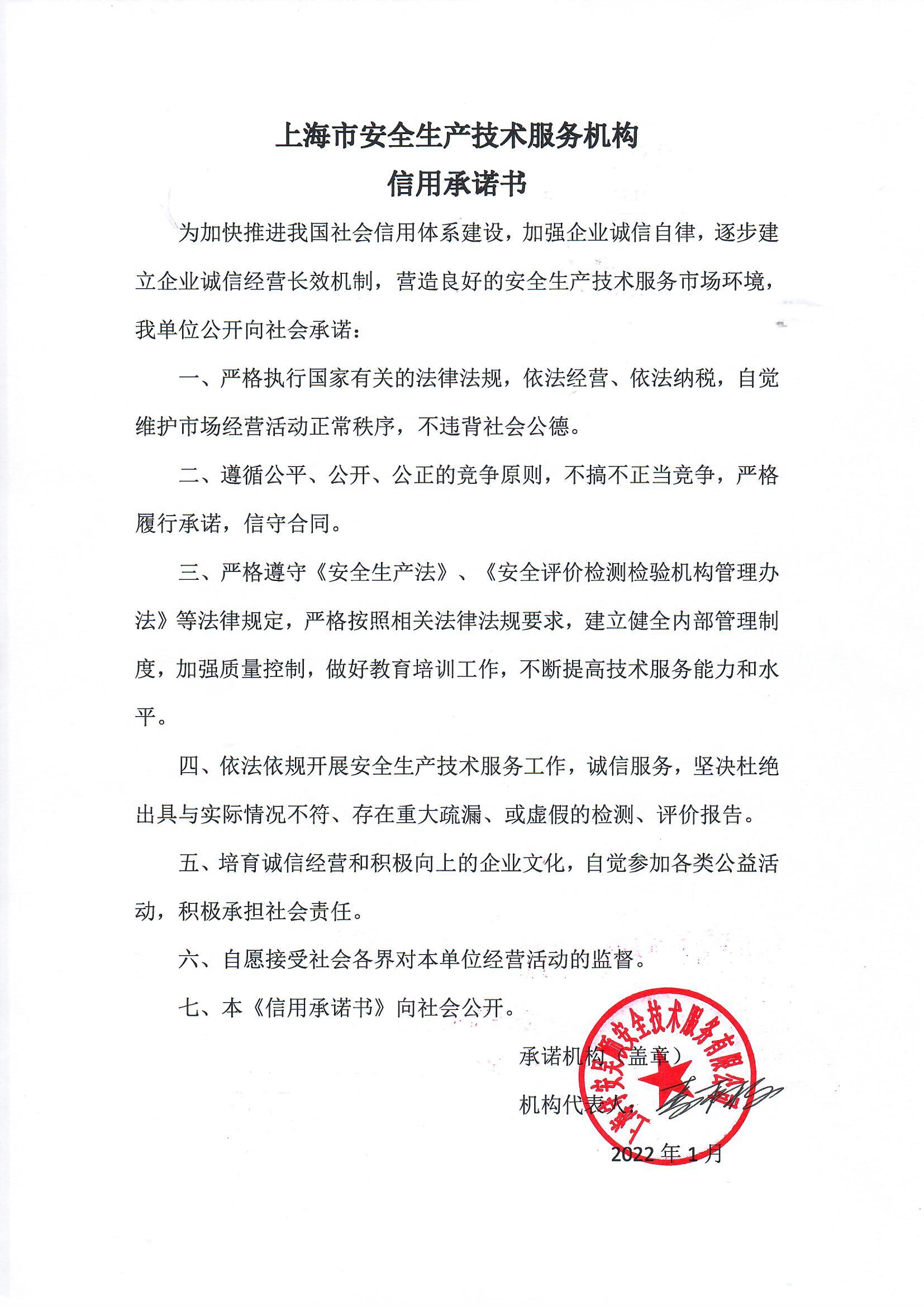 上海市安全生产技术服务机构信用承诺书