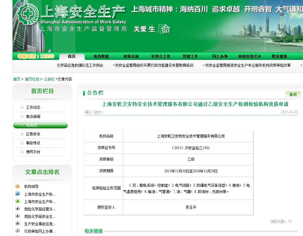 2015年11月,上海安乾卫安特安全技术管理服务有限公司通过乙级安全生产检测检验机构资质申请,已在上海市安全生产监督管理网站上公示。