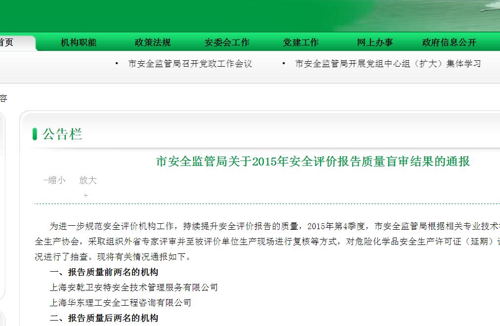 2月22日,上海市安监局发布《市安全监管局关于2015年安全评价报告质量盲审结果的通报》,卫安特公司报告质量获得第一名。