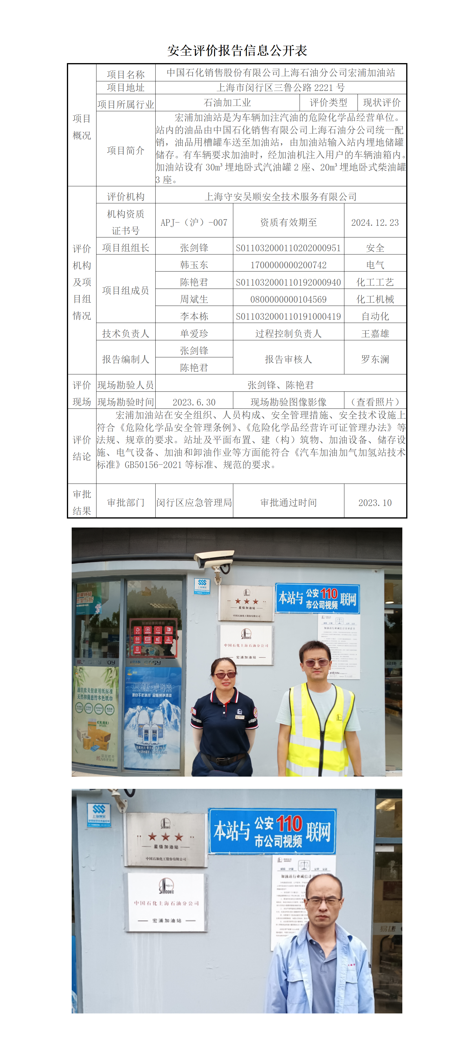 中国石化销售股份有限公司上海石油分公司宏浦加油站经营危险化学品安全现状评价