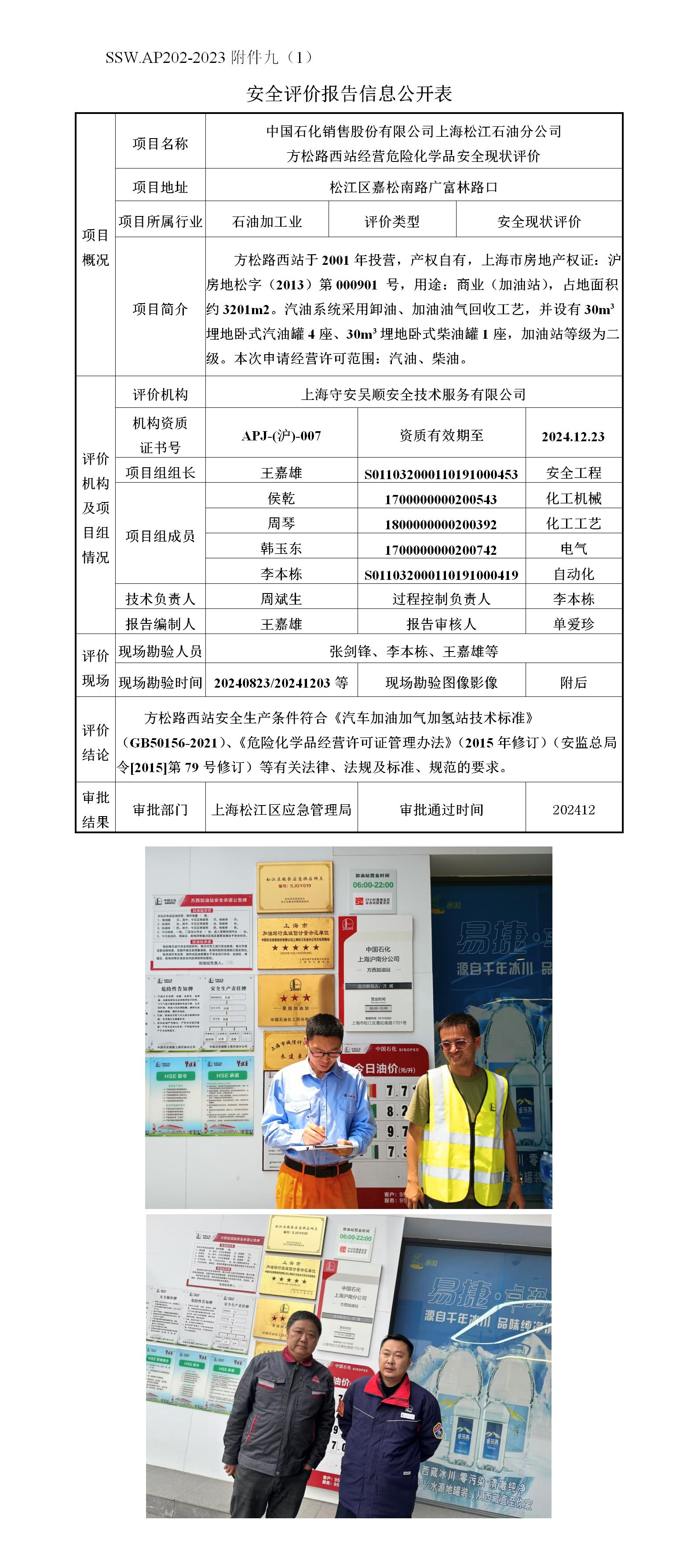 中国石化销售股份有限公司上海松江石油分公司方松路西站经营危险化学品安全现状评价