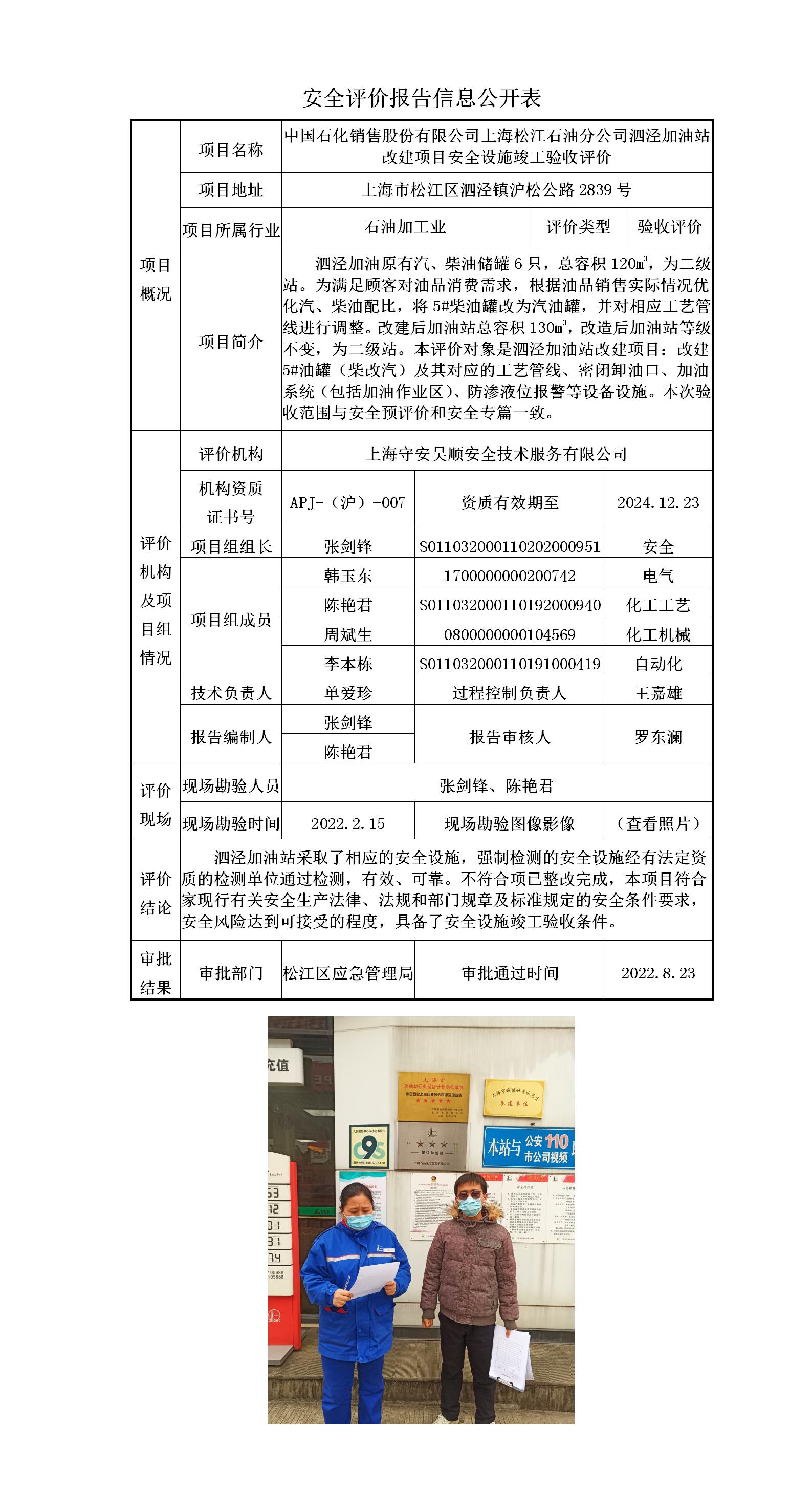 中国石化销售股份有限公司上海松江石油分公司泗泾加油站改建项目安全设施竣工验收评价
