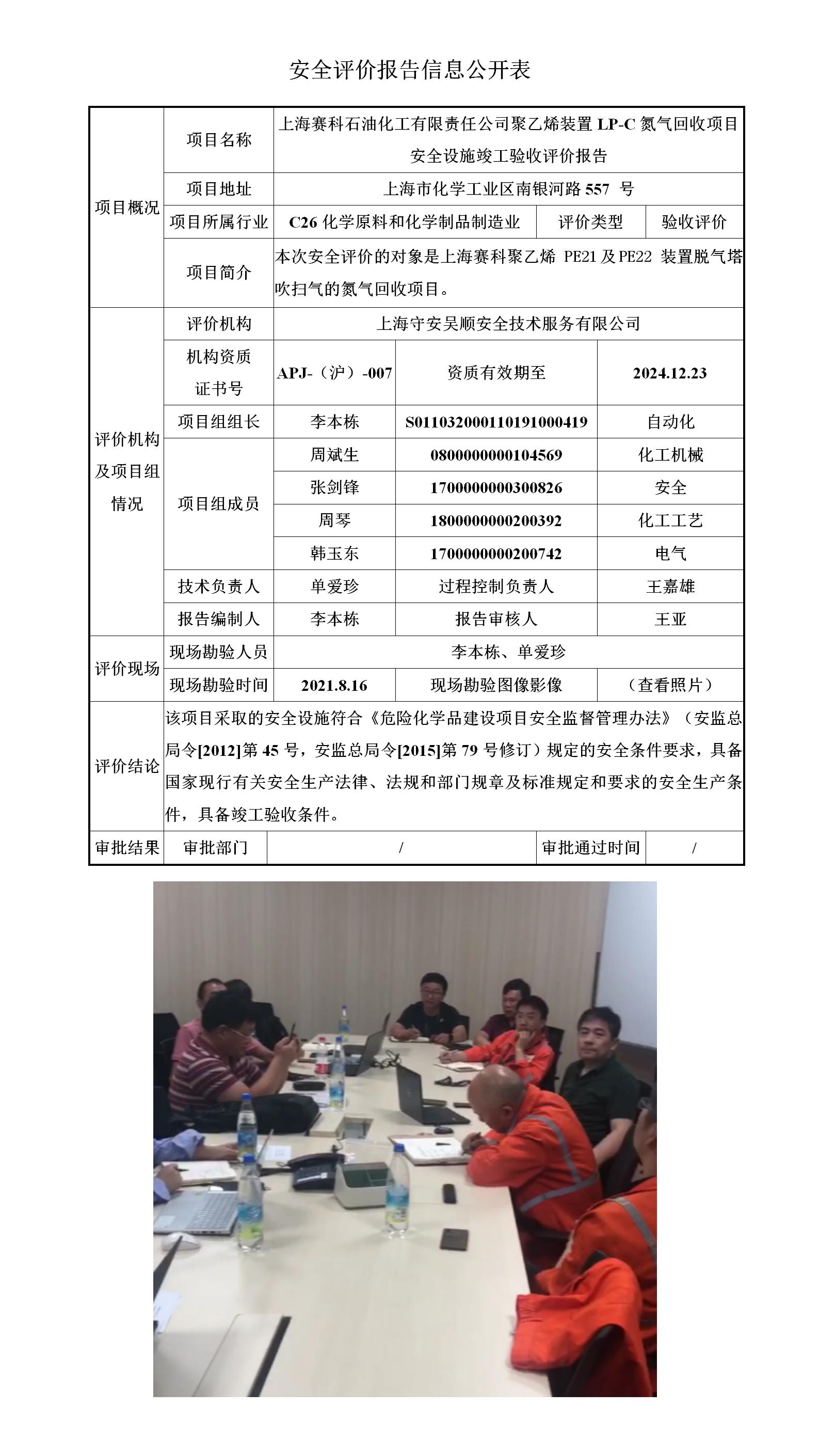 上海赛科石油化工有限责任公司聚乙烯装置LP-C氮气回收项目安全设施竣工验收评价报告