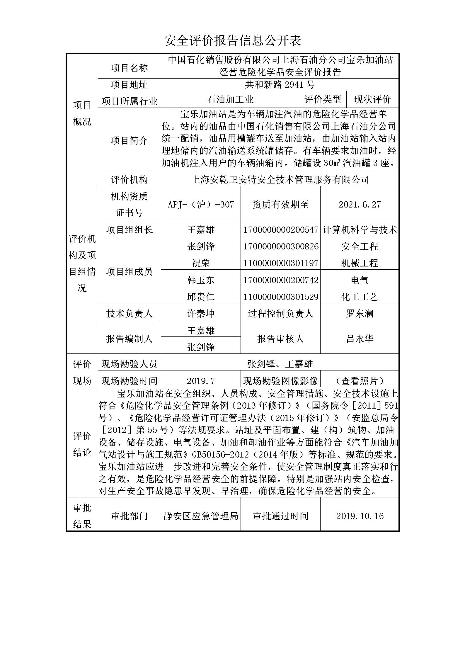 中国石化销售股份有限公司上海石油分公司宝乐加油站 经营危险化学品安全评价报告