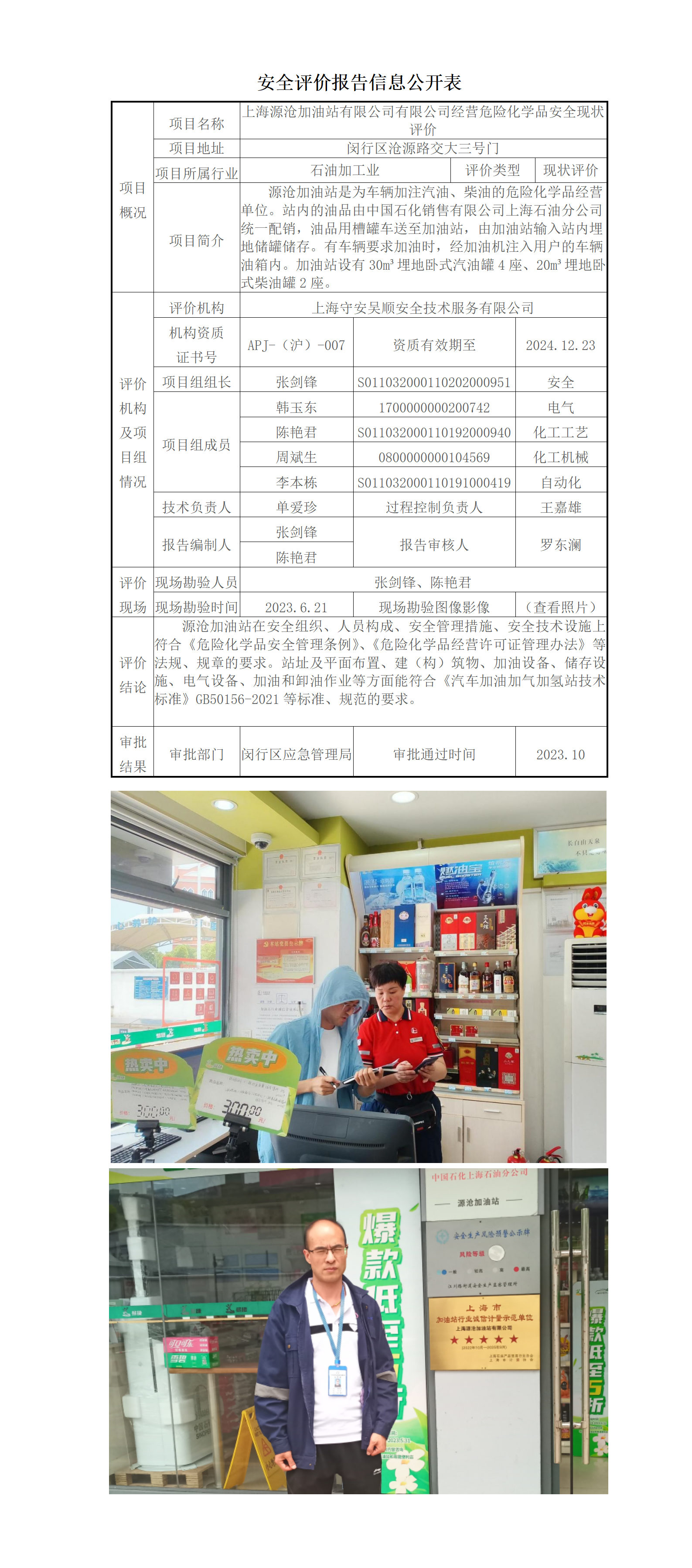 上海源沧加油站有限公司有限公司经营危险化学品安全现状评价