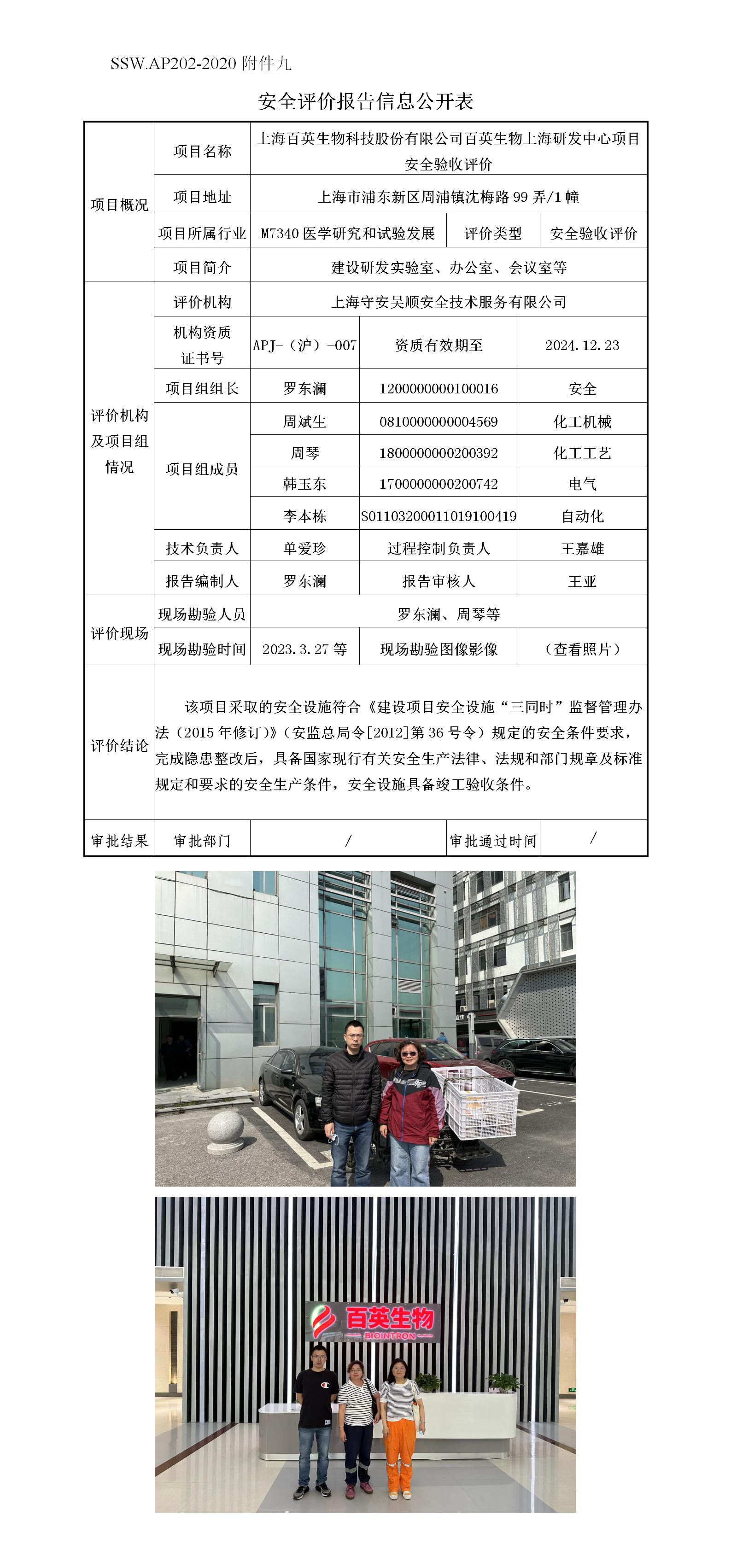 上海百英生物科技股份有限公司百英生物上海研发中心项目安全验收评价