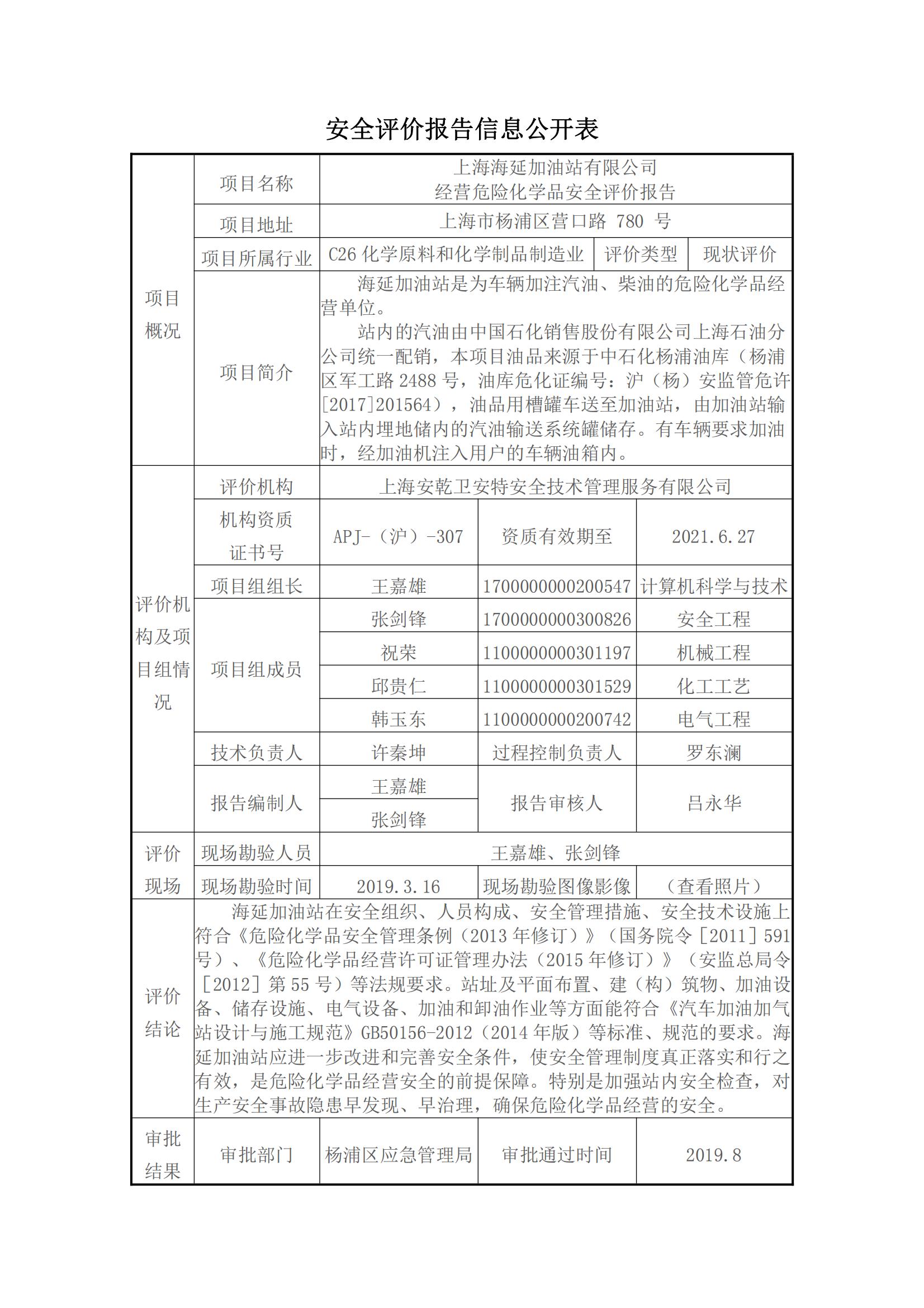上海海延加油站有限公司 经营危险化学品安全评价报告