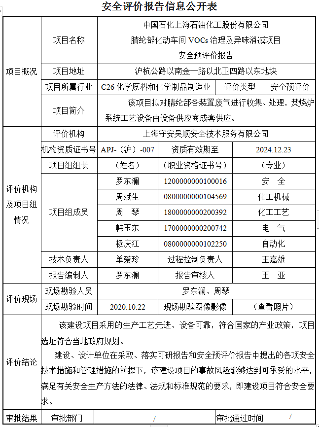 中国石化上海石油化工股份有限公司 腈纶部化动车间VOCs治理及异味消减项目 安全预评价报告