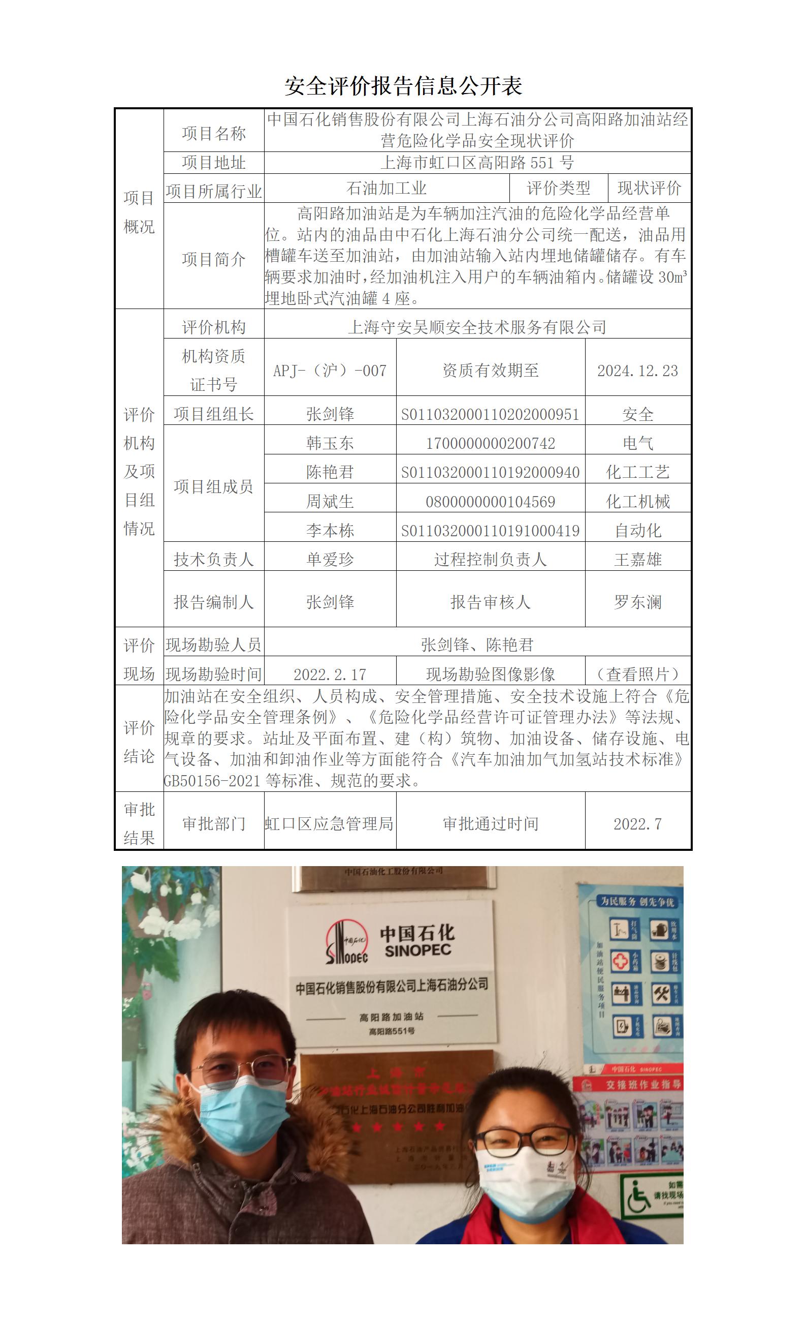 中国石化销售股份有限公司上海石油分公司高阳路加油站经营危险化学品安全现状评价