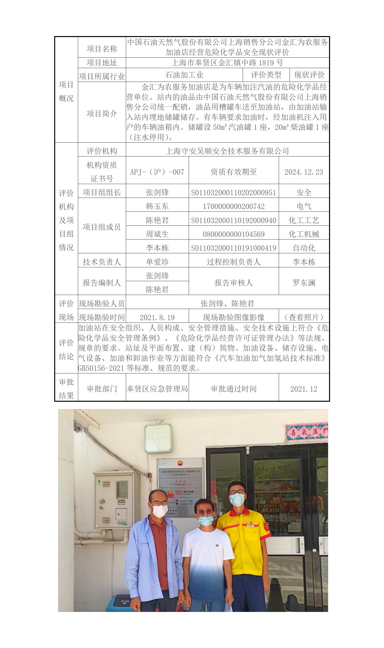 中国石油天然气股份有限公司上海销售分公司金汇为农服务加油店经营危险化学品安全现状评价
