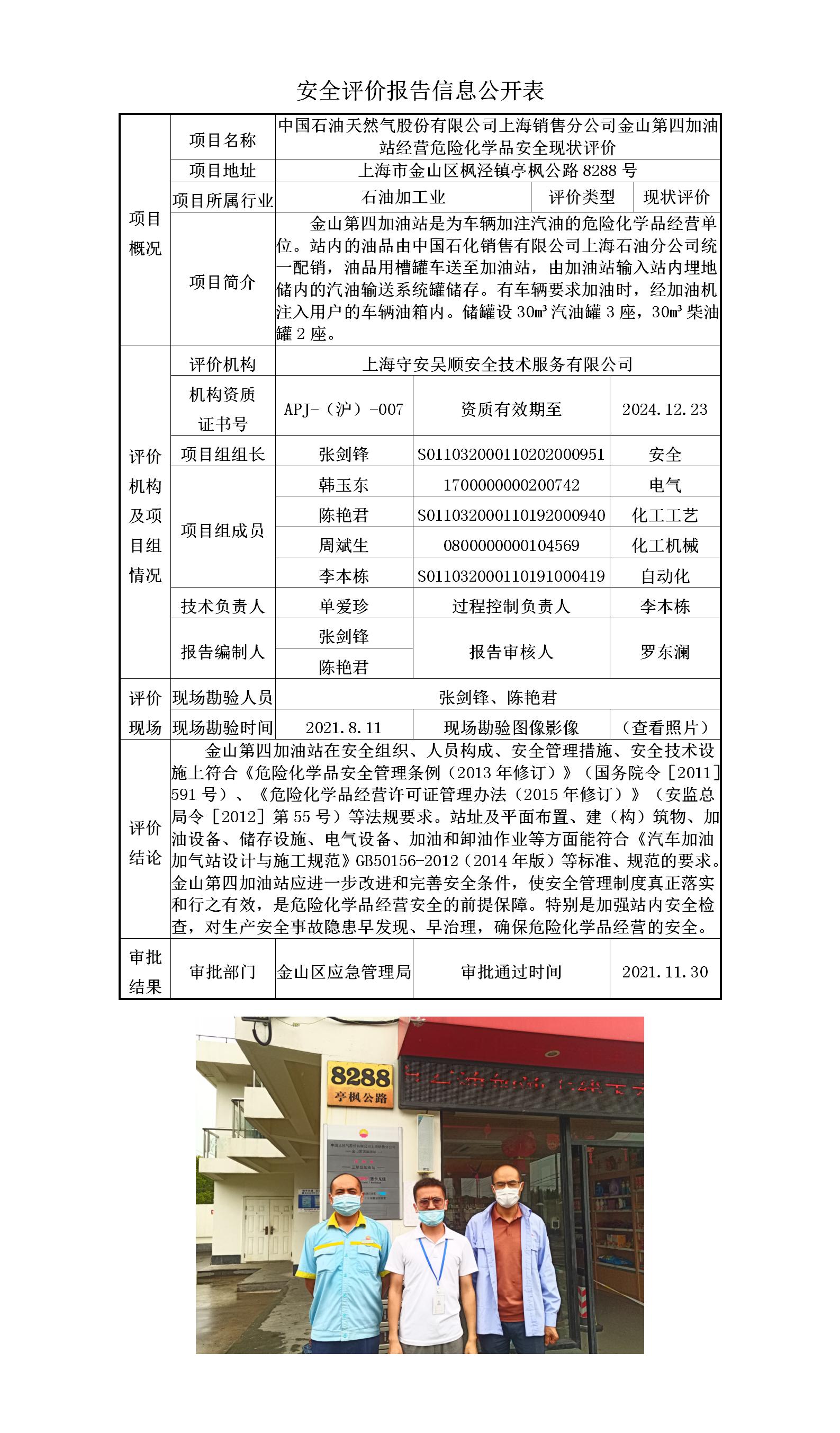 中国石油天然气股份有限公司上海销售分公司金山第四加油站经营危险化学品安全现状评价