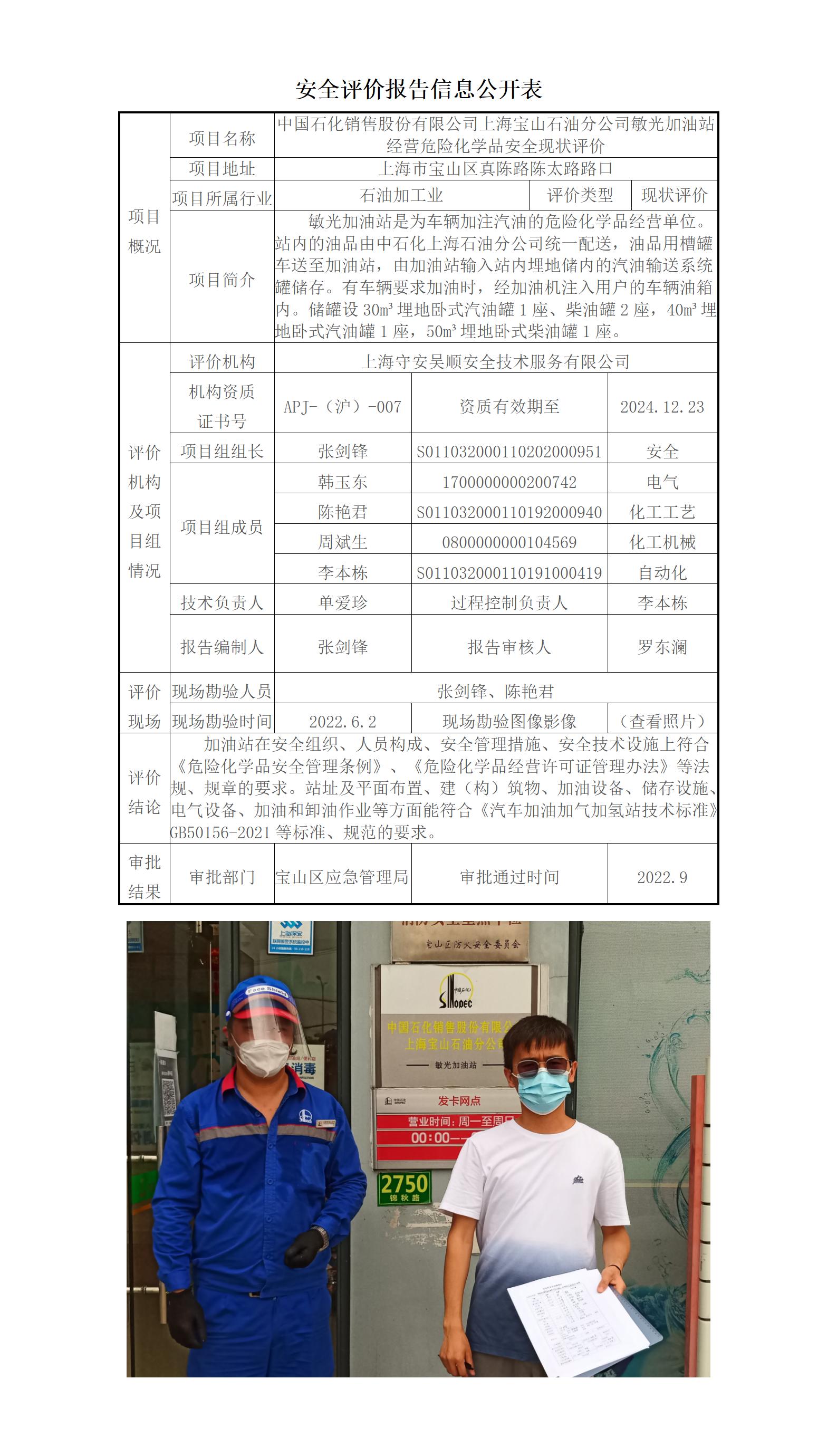 中国石化销售股份有限公司上海宝山石油分公司敏光加油站经营危险化学品安全现状评价