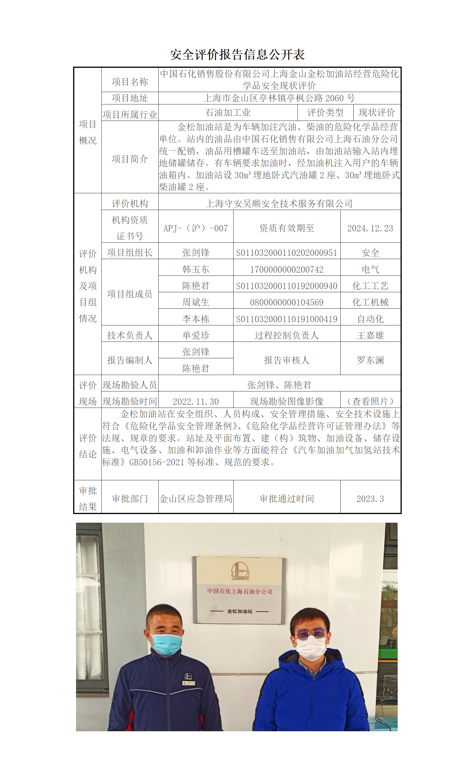 中国石化销售股份有限公司上海金山金松加油站经营危险化学品安全现状评价