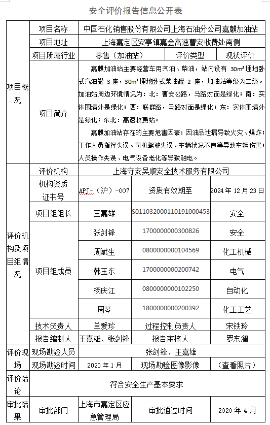 中国石化销售股份有限公司上海石油分公司嘉麒加油站安全现状评价报告