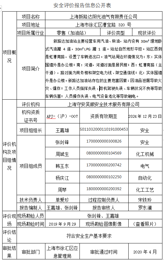 上海新路达阳光油气有限责任公司安全现状评价报告