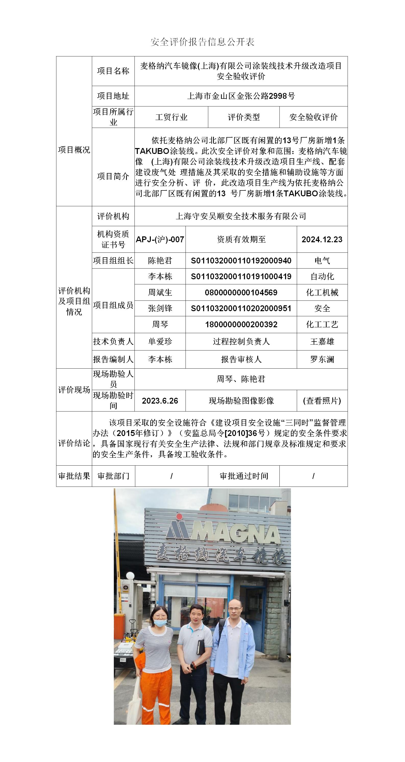 麦格纳汽车镜像(上海)有限公司涂装线技术升级改造项目安全验收评价