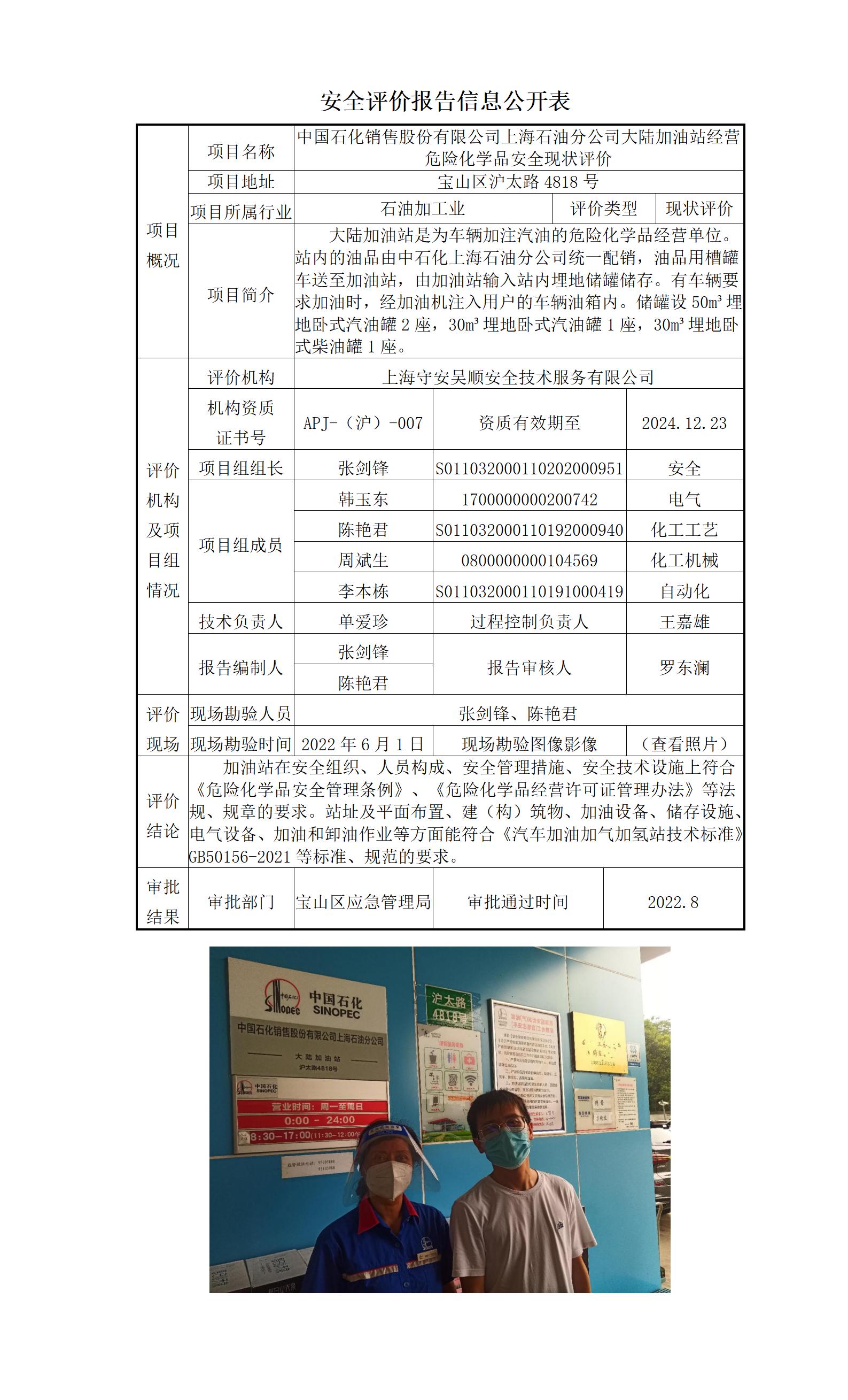 中国石化销售股份有限公司上海石油分公司大陆加油站经营危险化学品安全现状评价