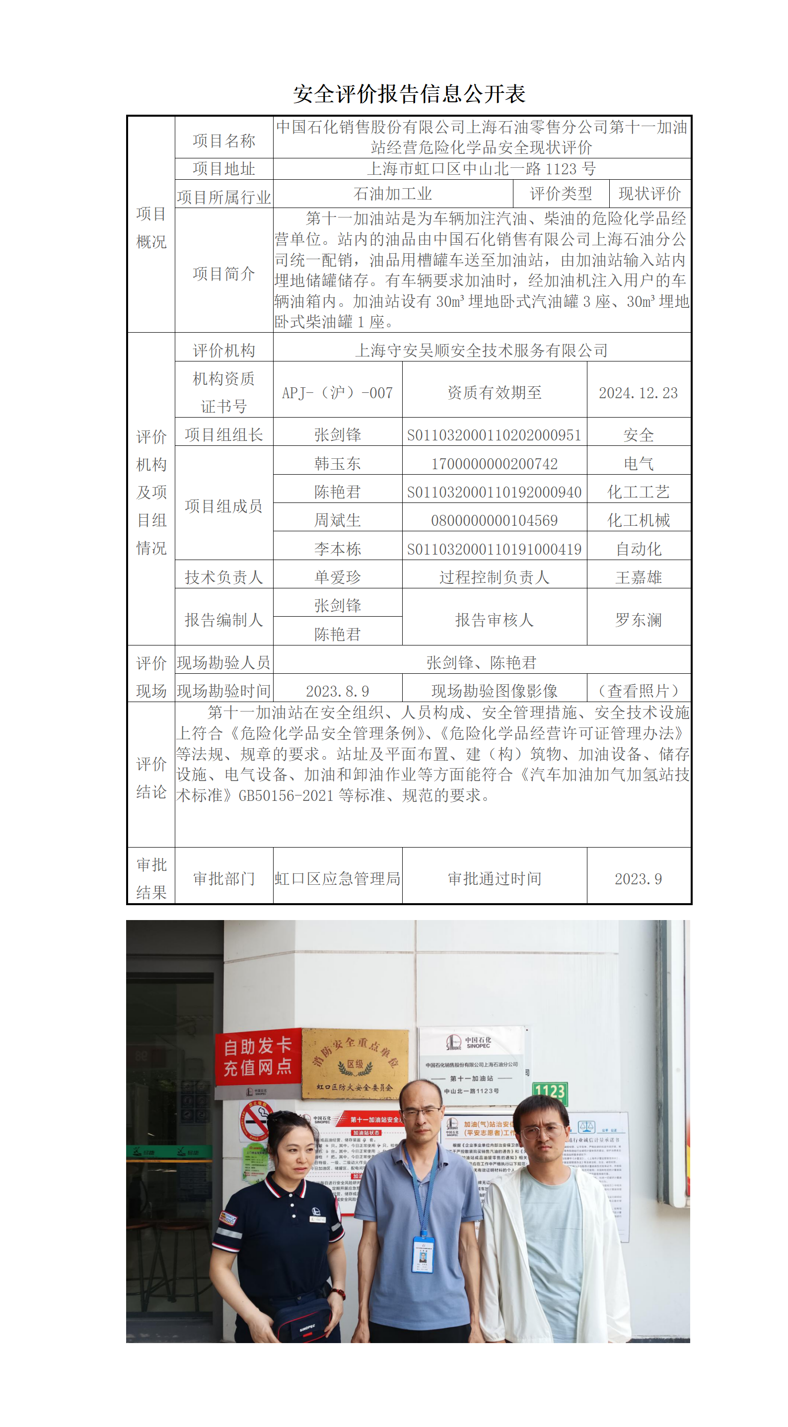 中国石化销售股份有限公司上海石油零售分公司第十一加油站经营危险化学品安全现状评价