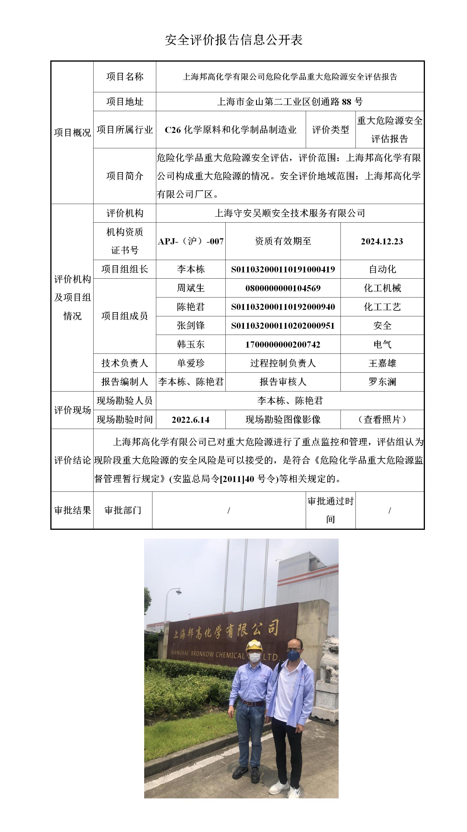 上海邦高化学有限公司危险化学品重大危险源安全评估