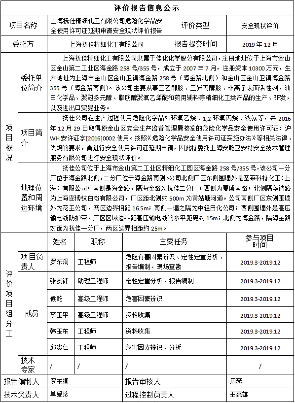 上海抚佳精细化工有限公司危险化学品安全使用许可证延期申请安全现状评价报告