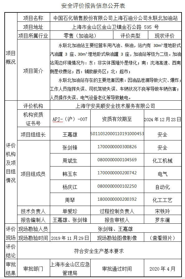 中国石化销售股份有限公司上海石油分公司永联北加油站安全现状评价报告