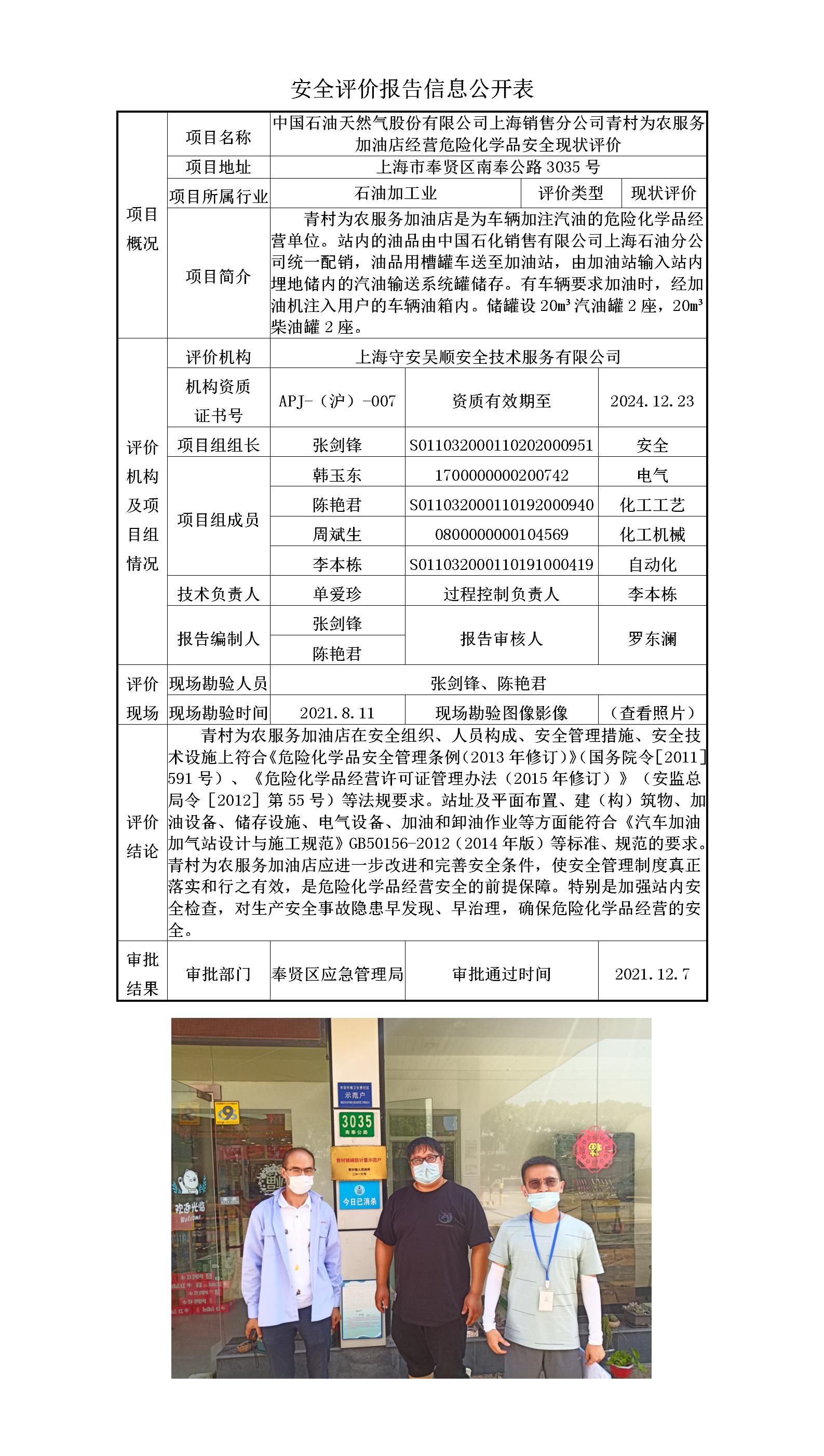 中国石油天然气股份有限公司上海销售分公司青村为农服务加油店经营危险化学品安全现状评价