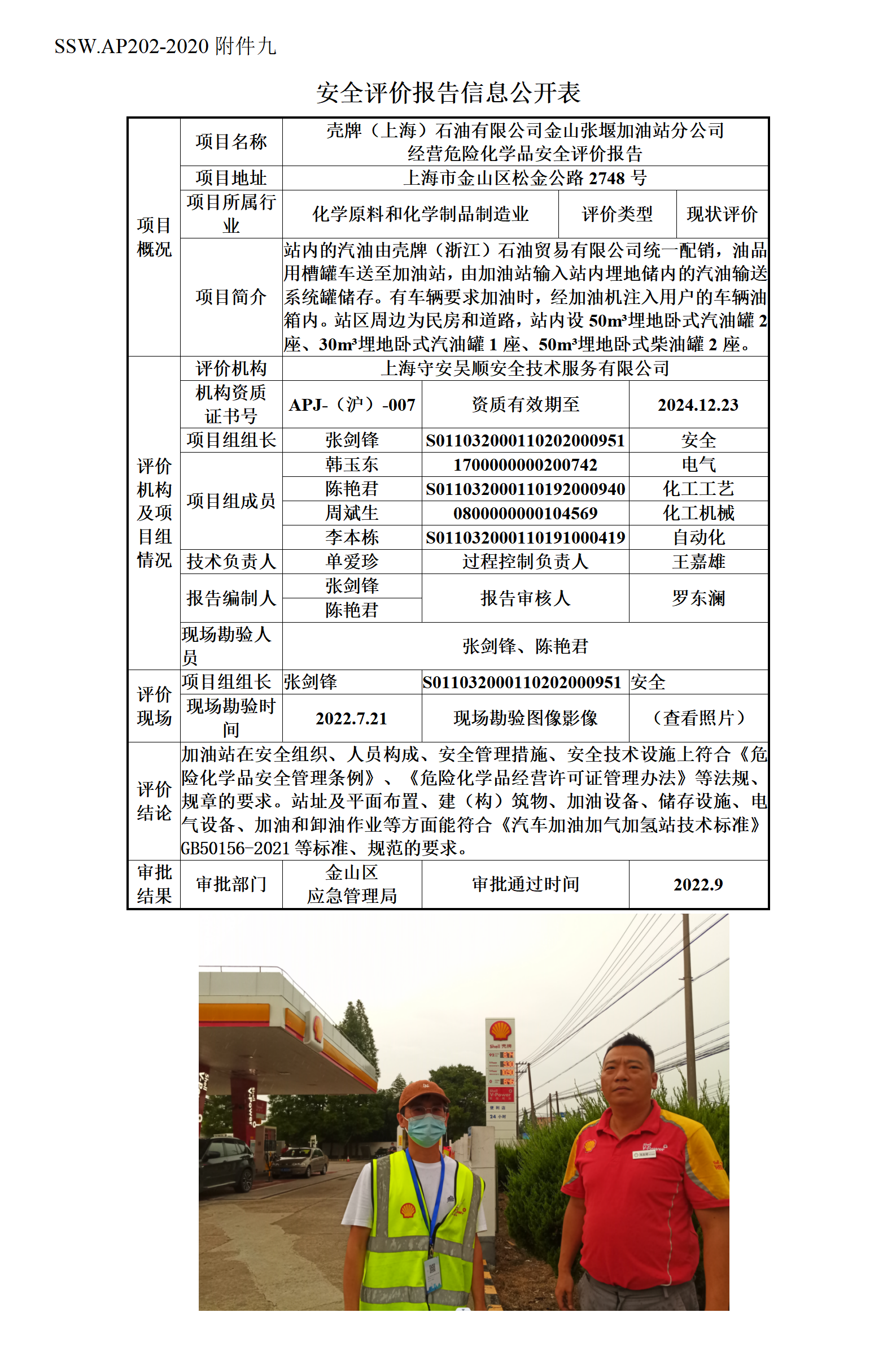 壳牌(上海)石油有限公司金山张堰加油站分公司经营危险化学品安全现状评价