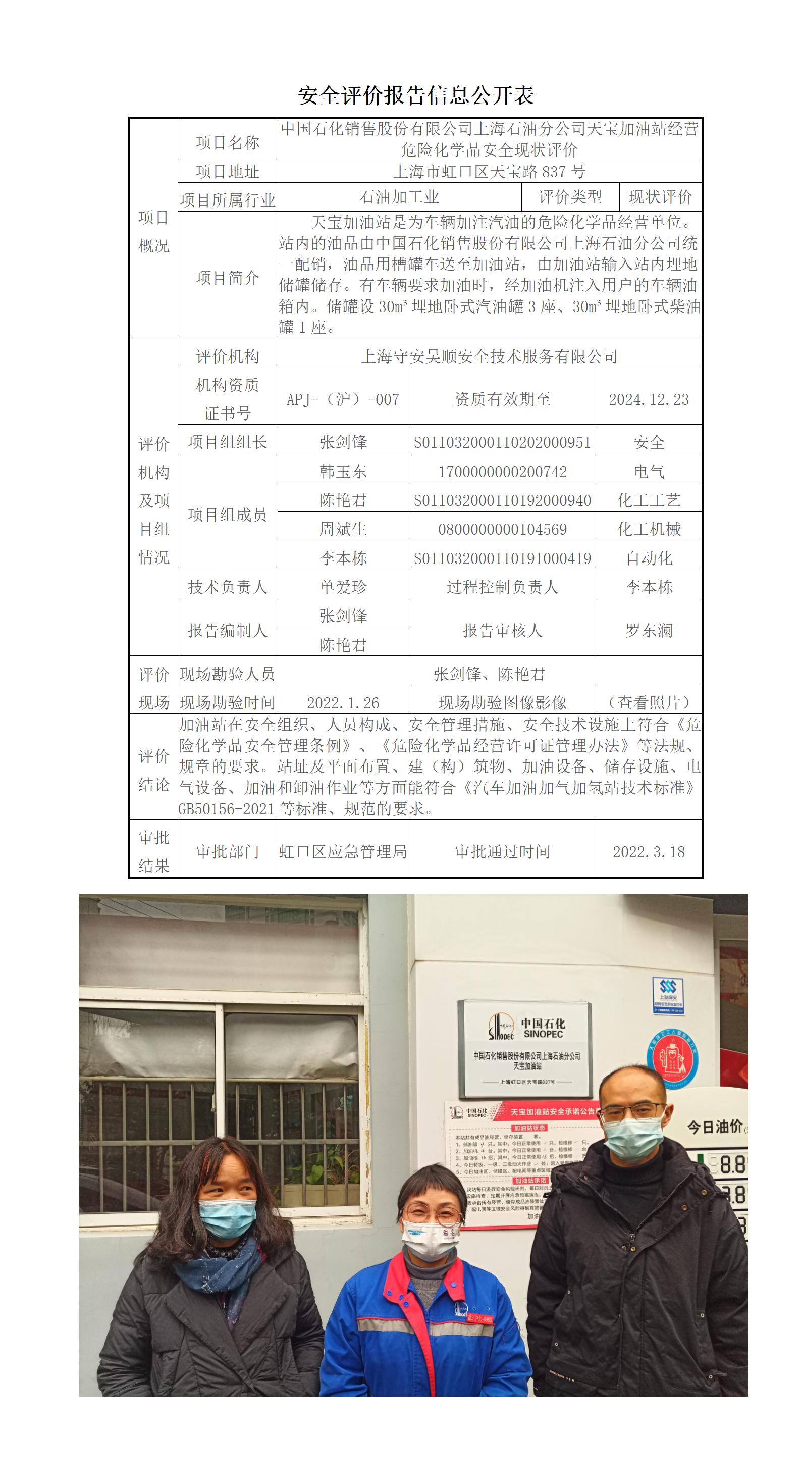 中国石化销售股份有限公司上海石油分公司天宝加油站经营危险化学品安全现状评价