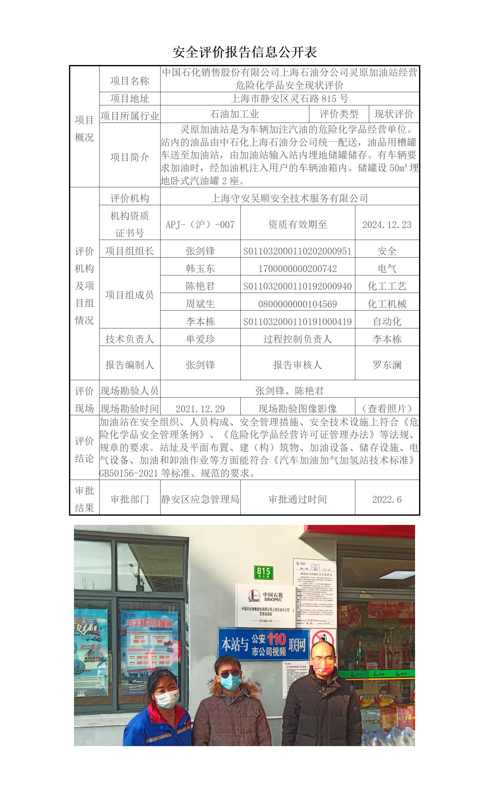 中国石化销售股份有限公司上海石油分公司灵原加油站经营危险化学品安全现状评价