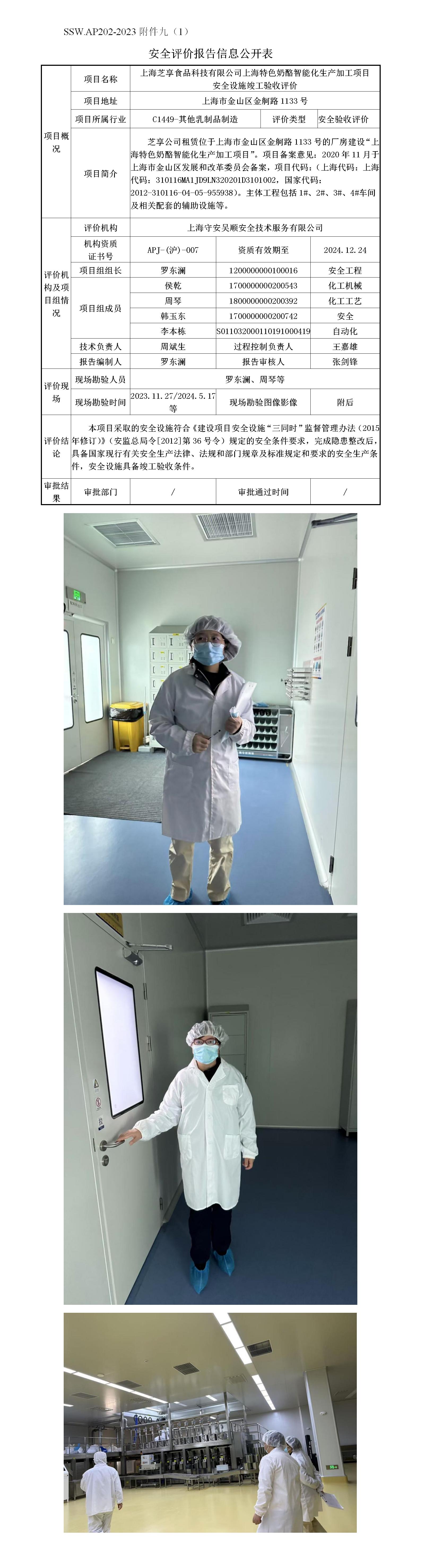 上海芝享食品科技有限公司上海特色奶酪智能化生产加工项目 安全设施竣工验收评价