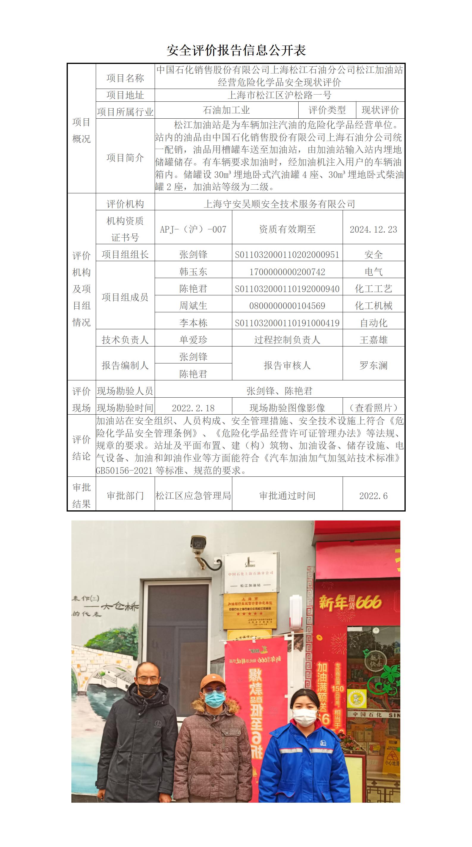 中国石化销售股份有限公司上海松江石油分公司松江加油站经营危险化学品安全现状评价