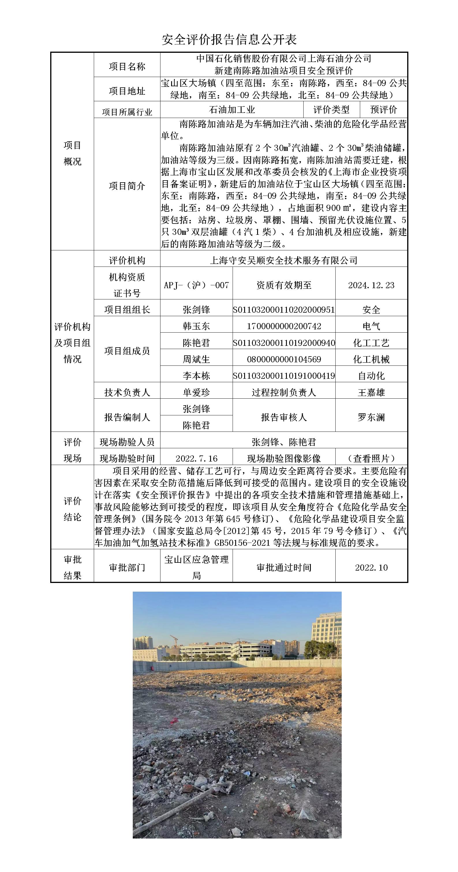 中国石化销售股份有限公司上海石油分公司新建南陈路加油站项目安全预评价