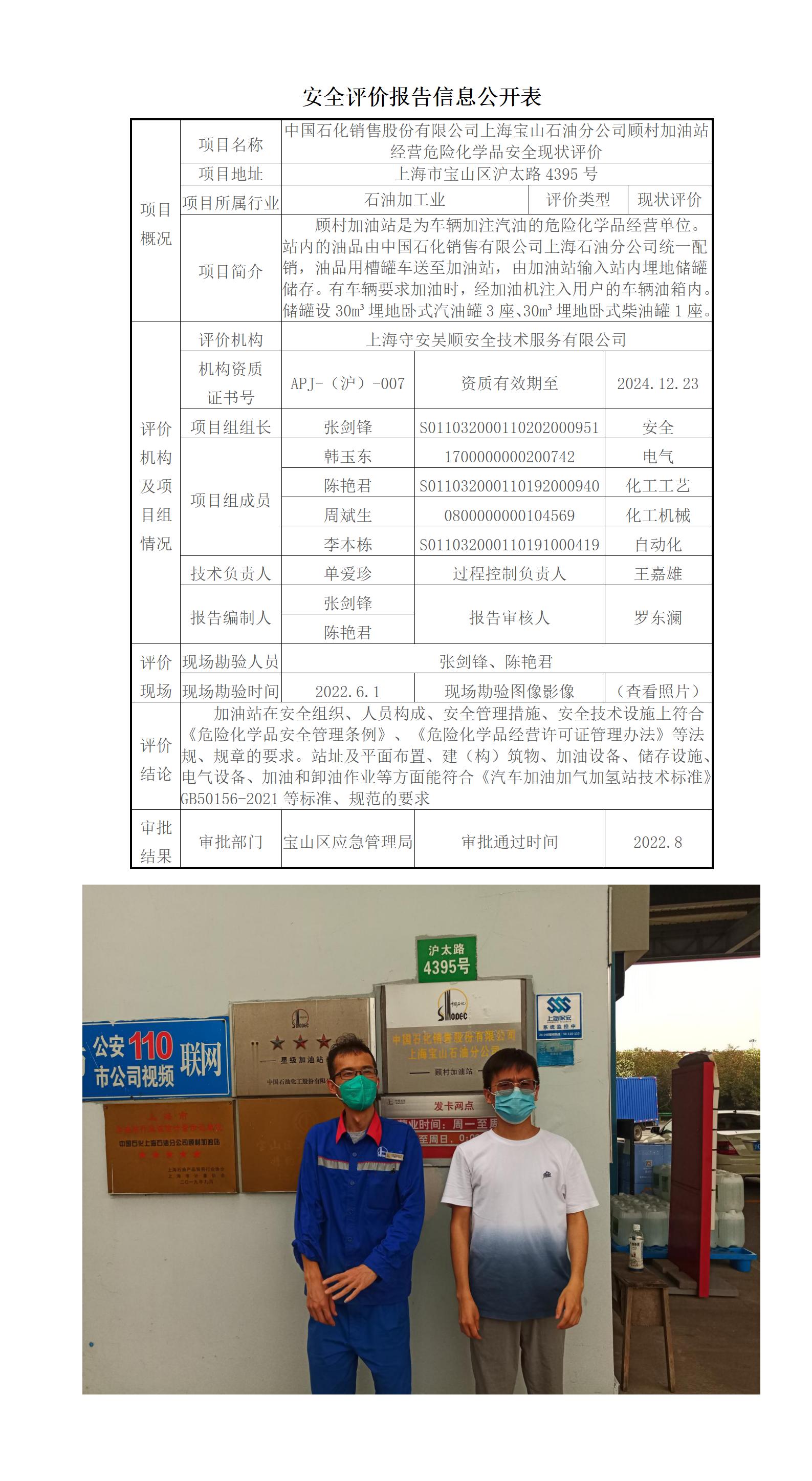 中国石化销售股份有限公司上海宝山石油分公司顾村加油站经营危险化学品安全现状评价