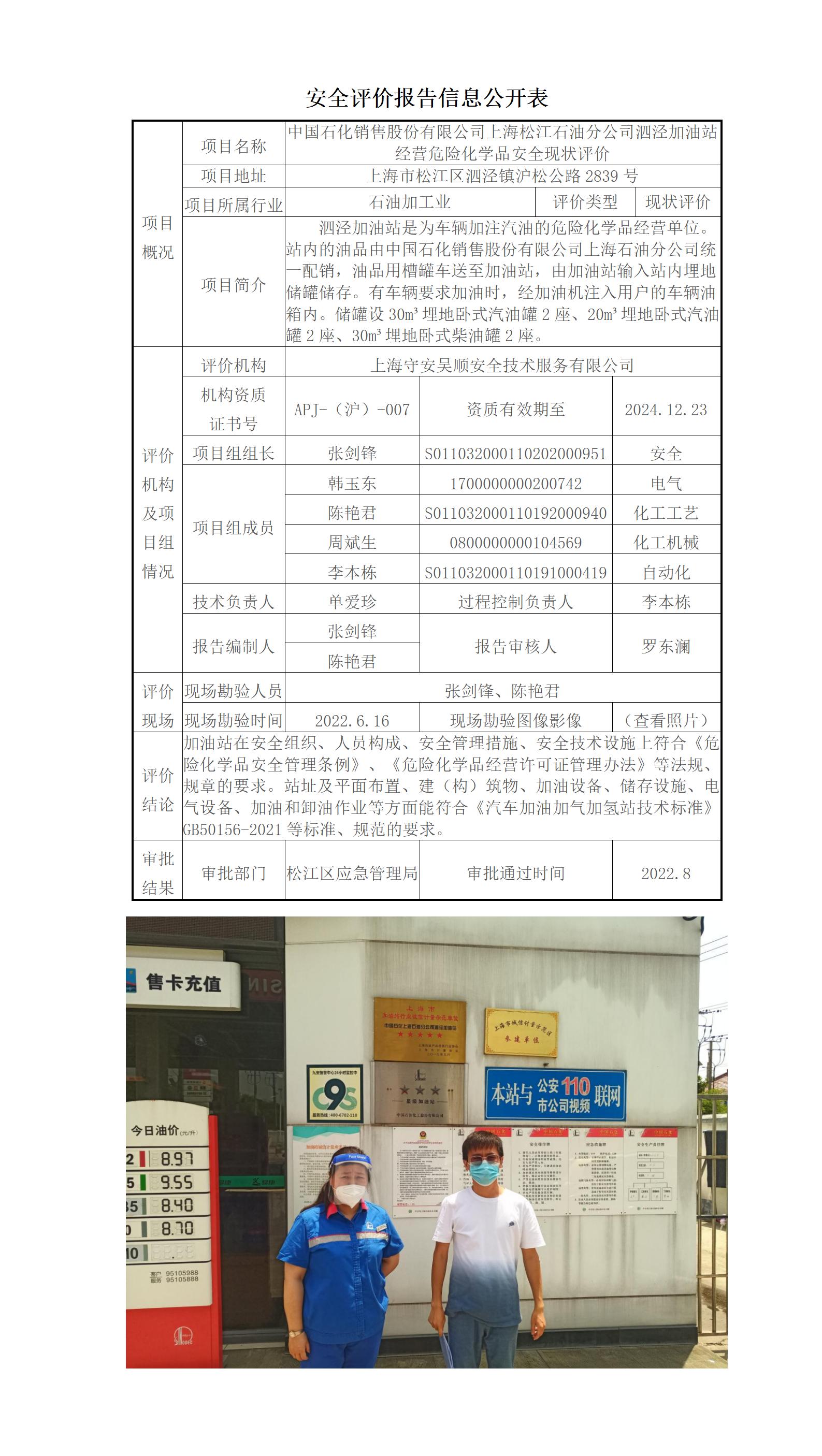 中国石化销售股份有限公司上海松江石油分公司泗泾加油站经营危险化学品安全现状评价