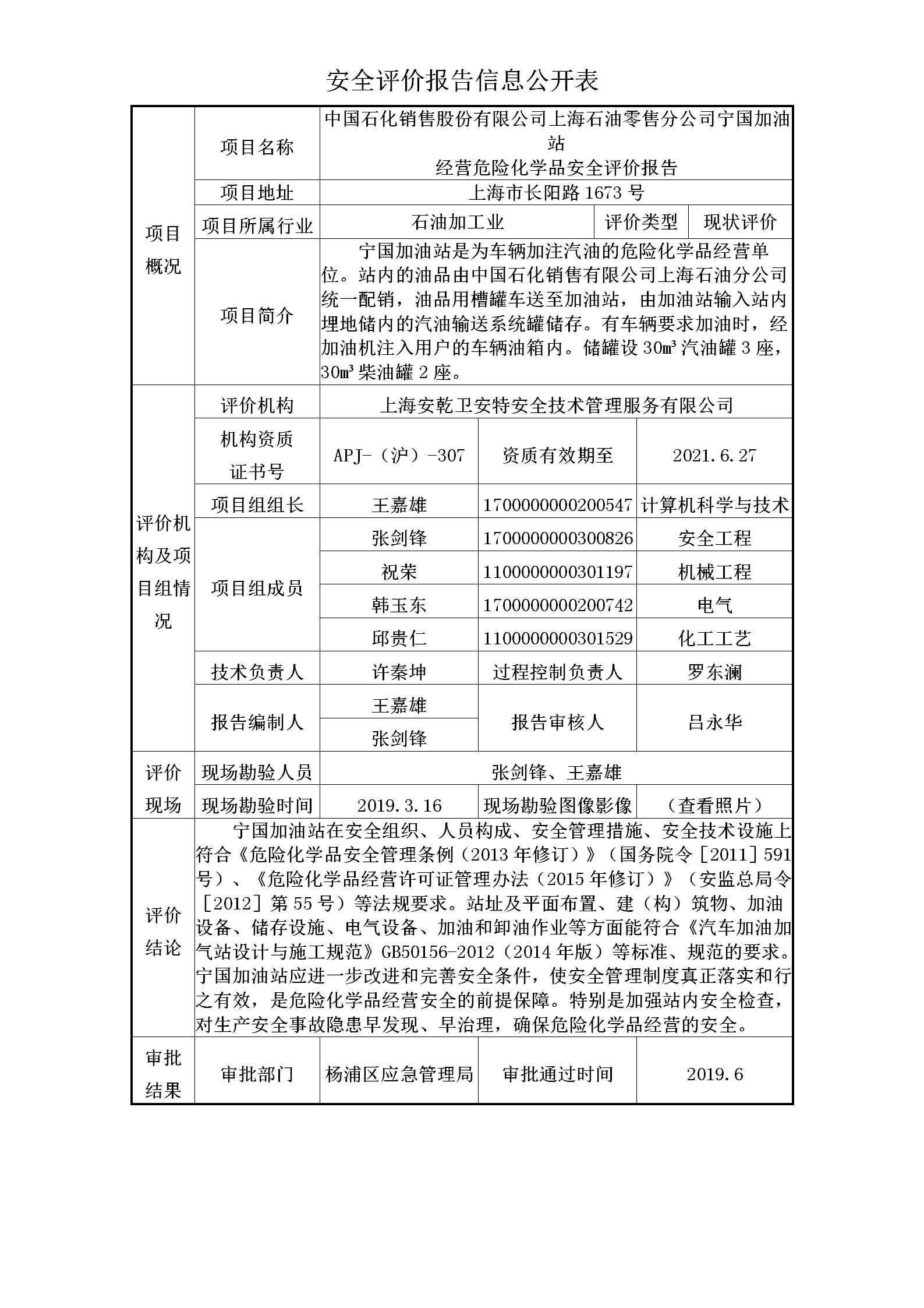 中国石化销售股份有限公司上海石油零售分公司宁国加油站经营危险化学品安全评价报告