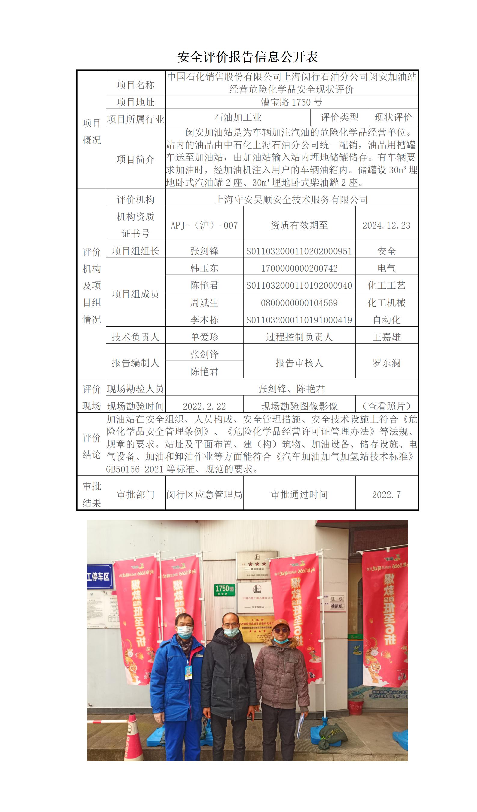 中国石化销售股份有限公司上海闵行石油分公司闵安加油站经营危险化学品安全现状评价
