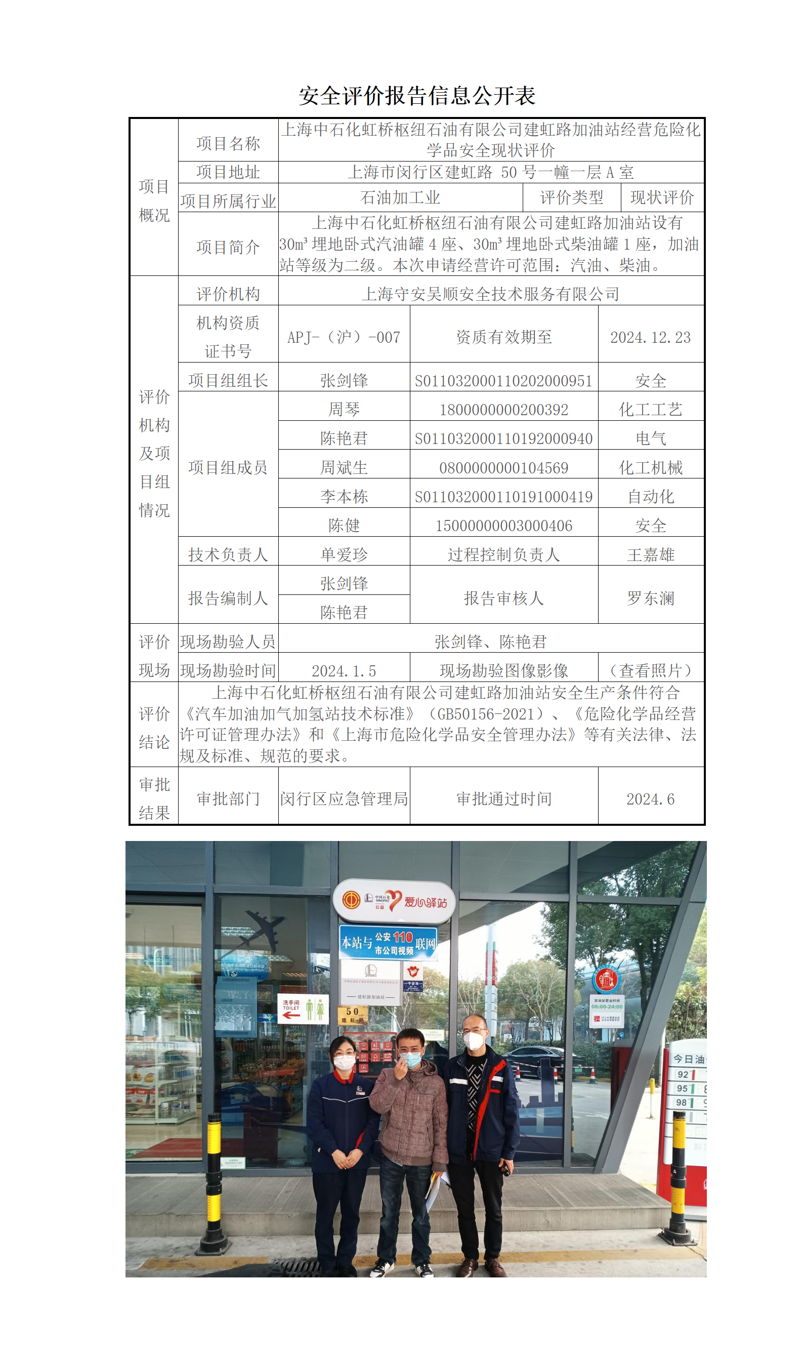 上海中石化虹桥枢纽石油有限公司建虹路加油站经营危险化学品安全现状评价