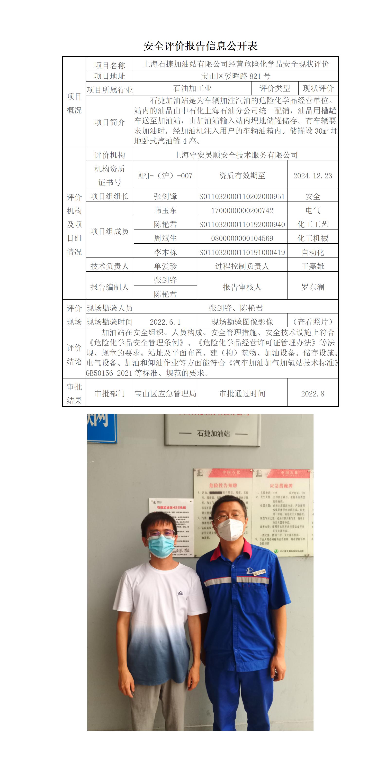 上海石捷加油站有限公司经营危险化学品安全现状评价