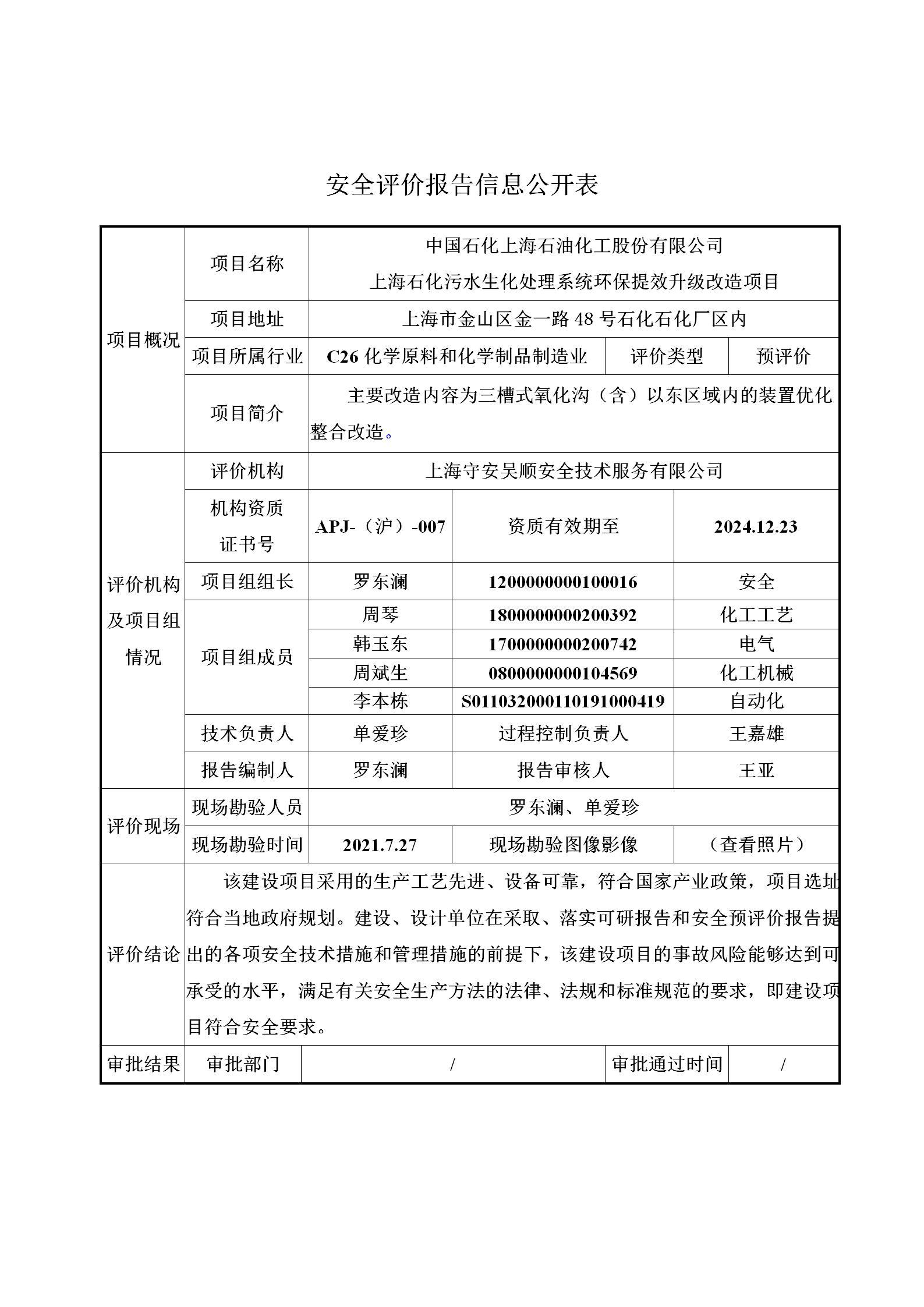 中国石化上海石油化工股份有限公司上海石化污水生化处理系统环保提效升级改造项目