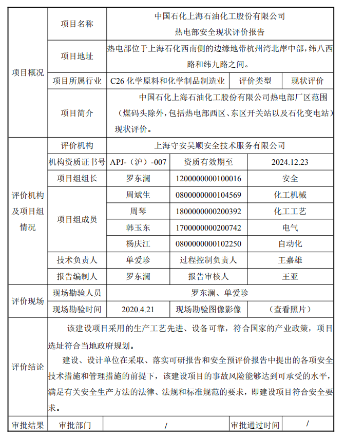 中国石化上海石油化工股份有限公司 热电部安全现状评价报告