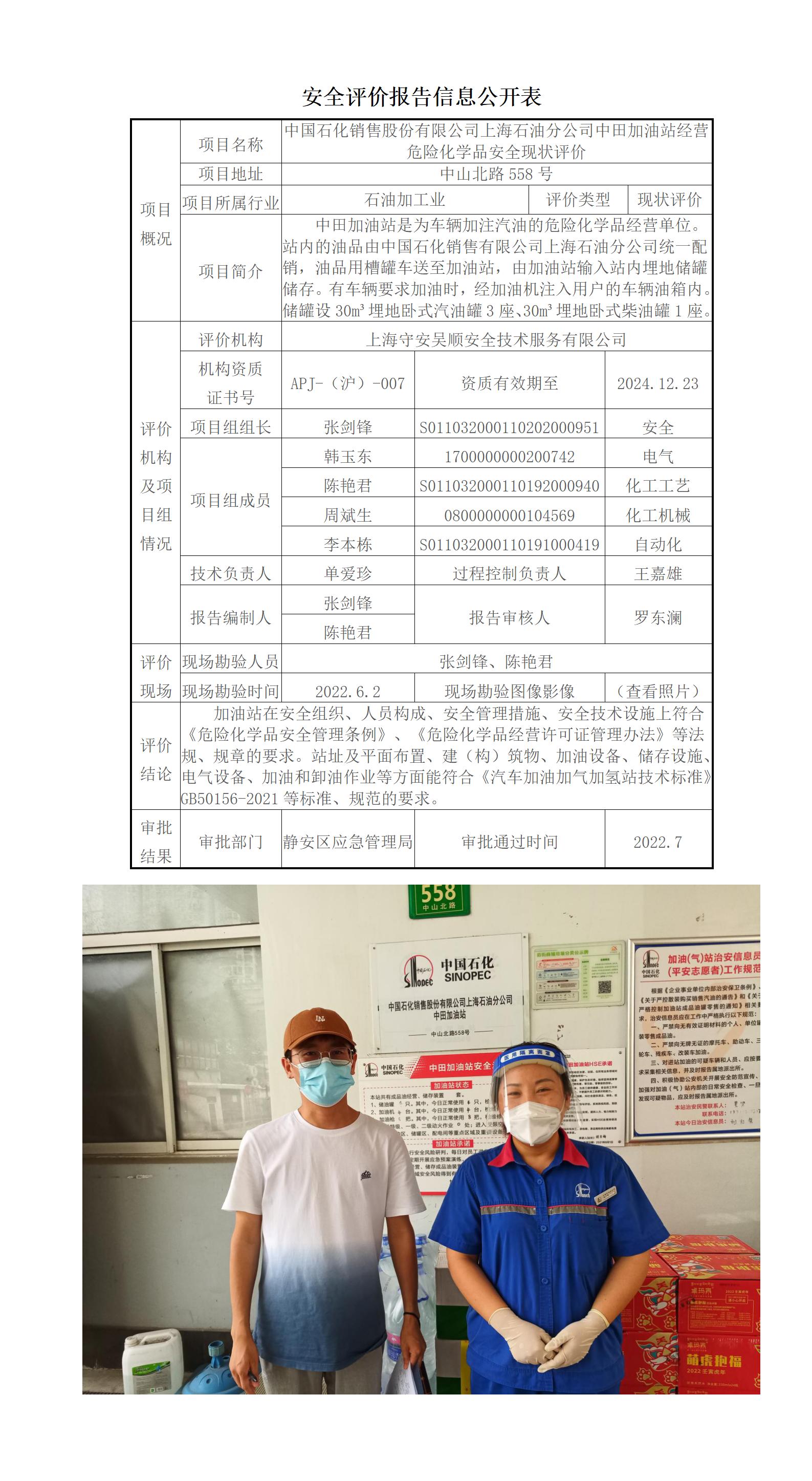 中国石化销售股份有限公司上海石油分公司中田加油站经营危险化学品安全现状评价