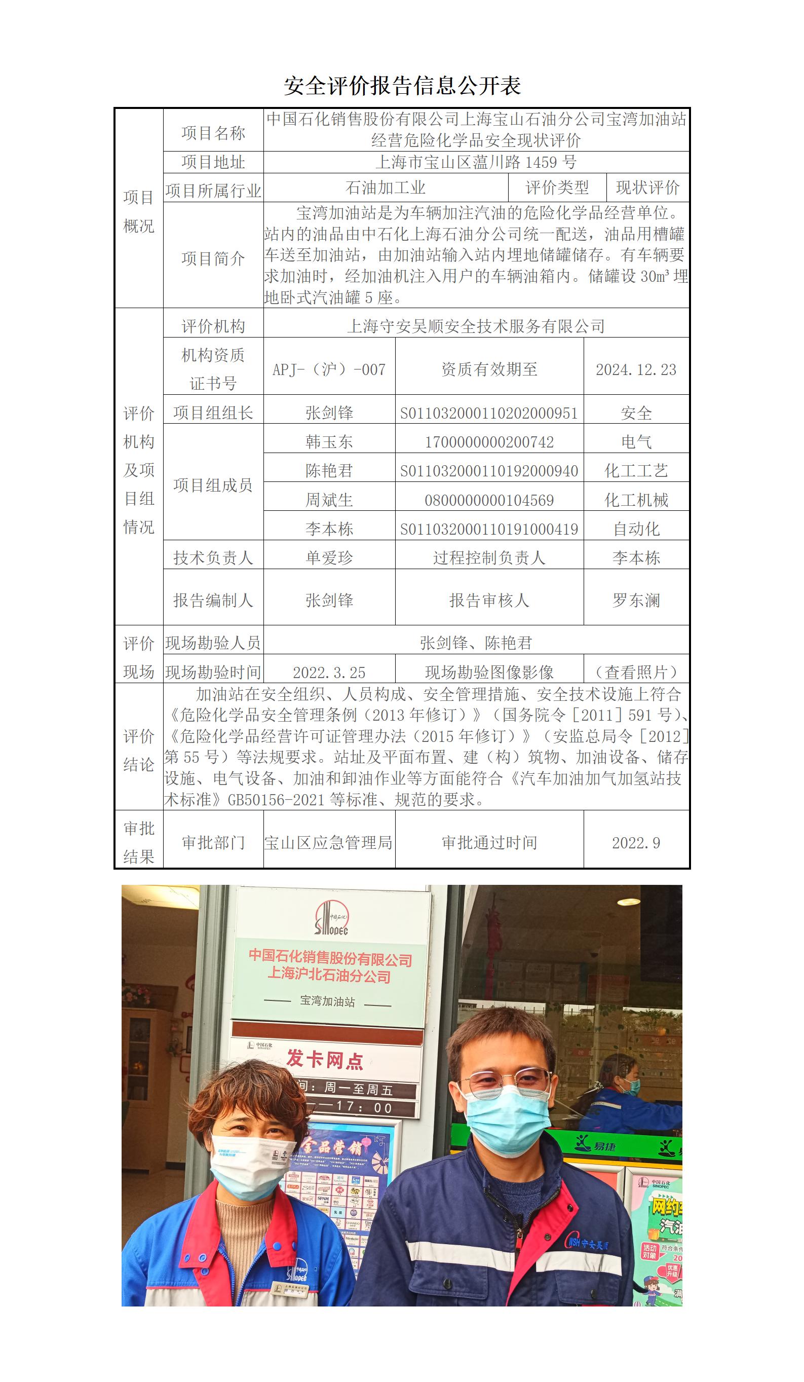 中国石化销售股份有限公司上海宝山石油分公司宝湾加油站经营危险化学品安全现状评价
