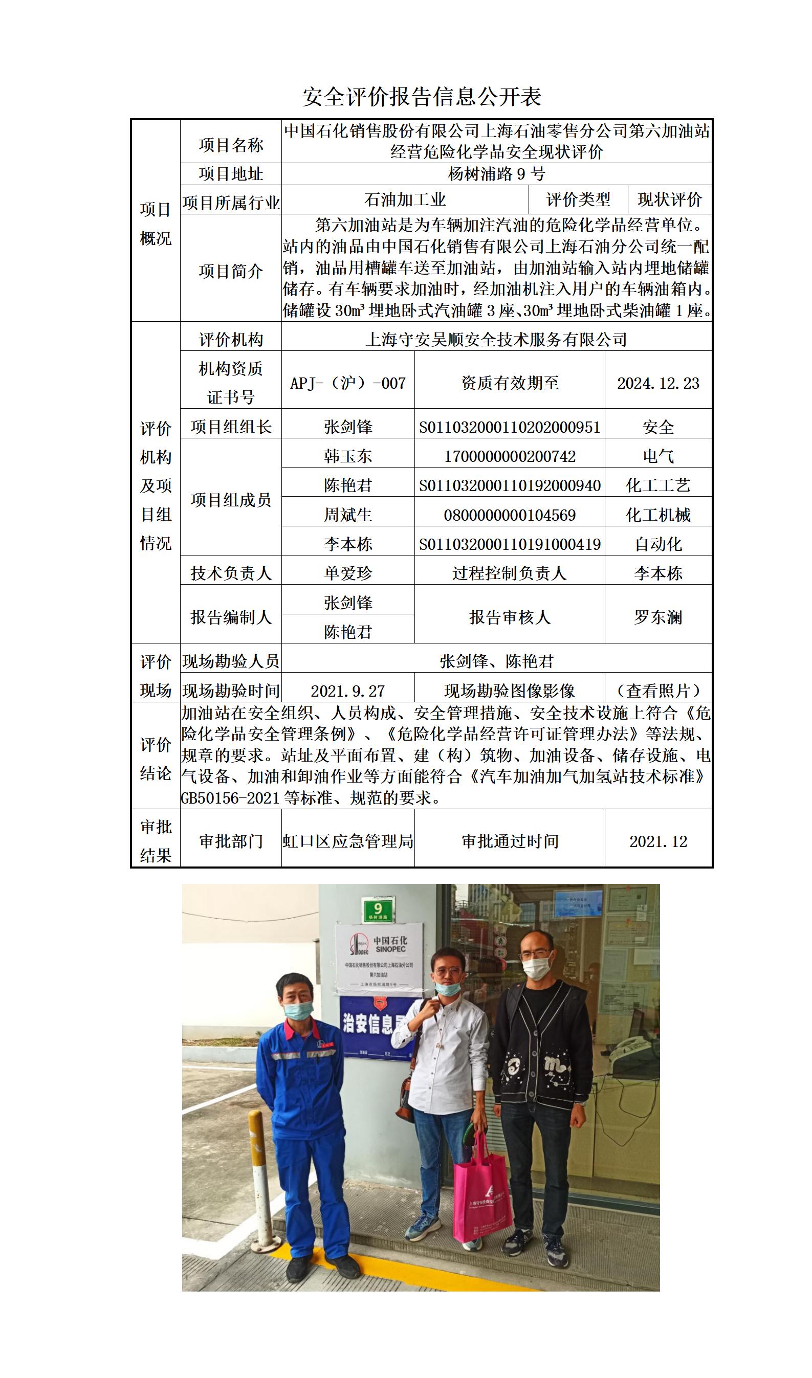 中国石化销售股份有限公司上海石油零售分公司第六加油站经营危险化学品安全现状评价