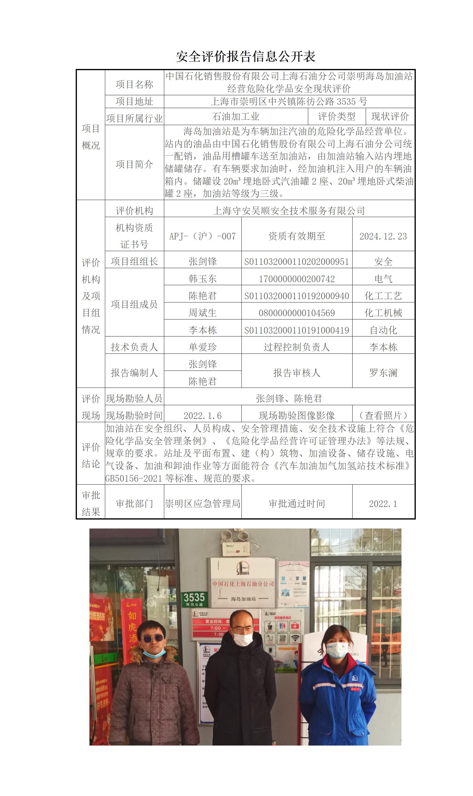 中国石化销售股份有限公司上海石油分公司崇明海岛加油站经营危险化学品安全现状评价