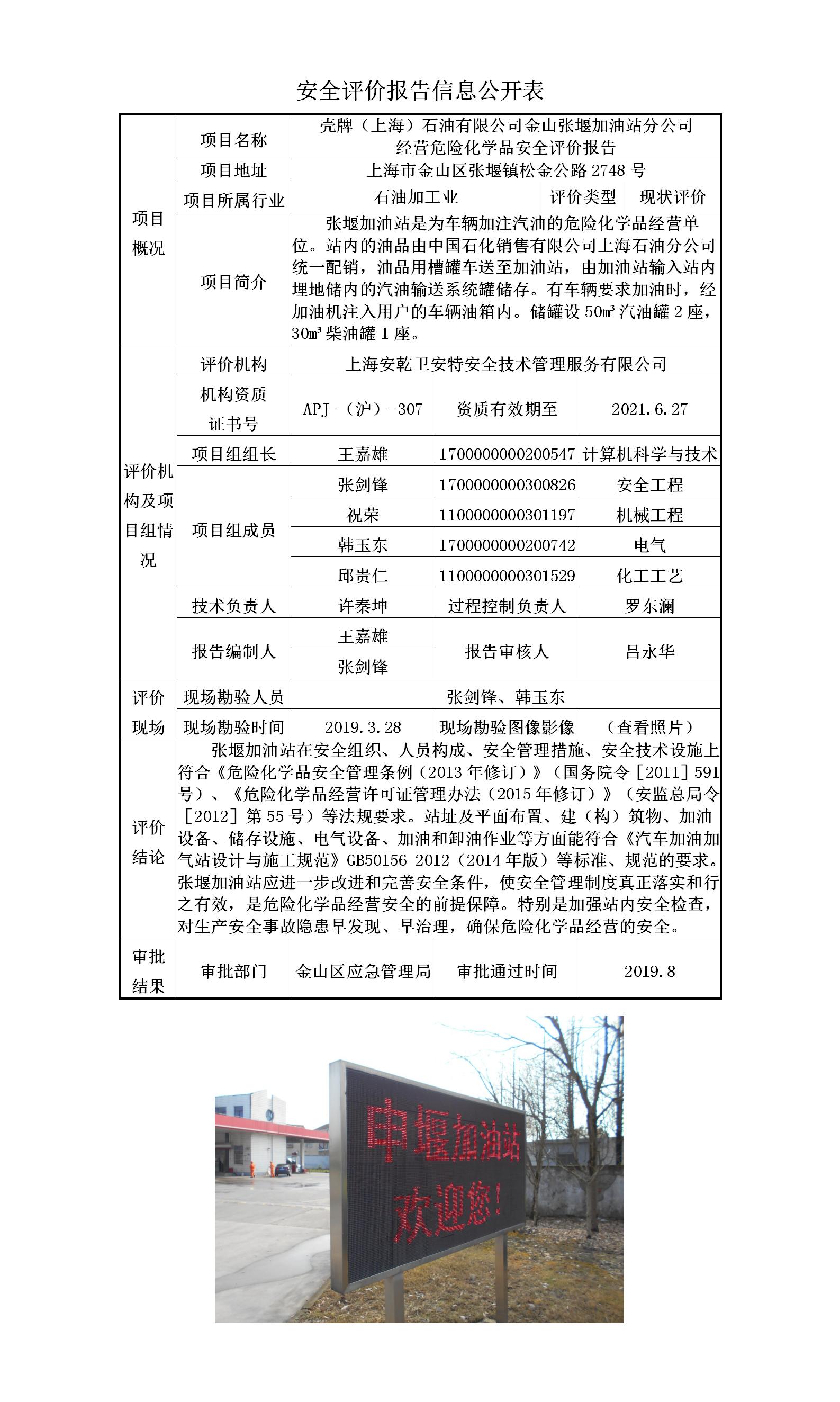 壳牌(上海)石油有限公司金山张堰加油站分公司 经营危险化学品安全评价报告