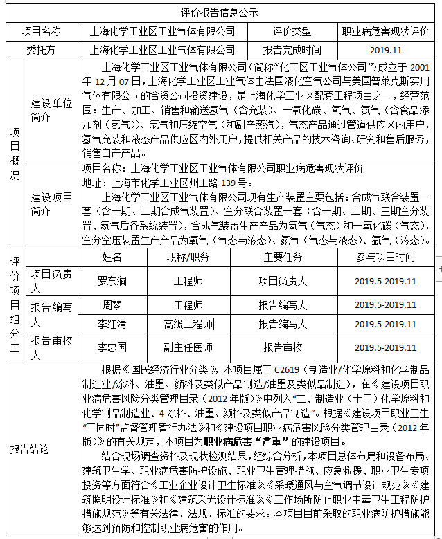 上海化学工业区工业气体有限公司职业病危害现状评价报告