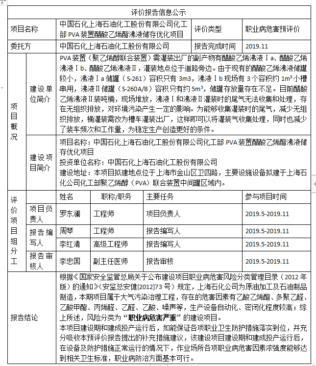 中国石化上海石油化工股份有限公司化工部PVA装置醋酸乙烯酯沸液储存优化项目职业病危害预评价报告