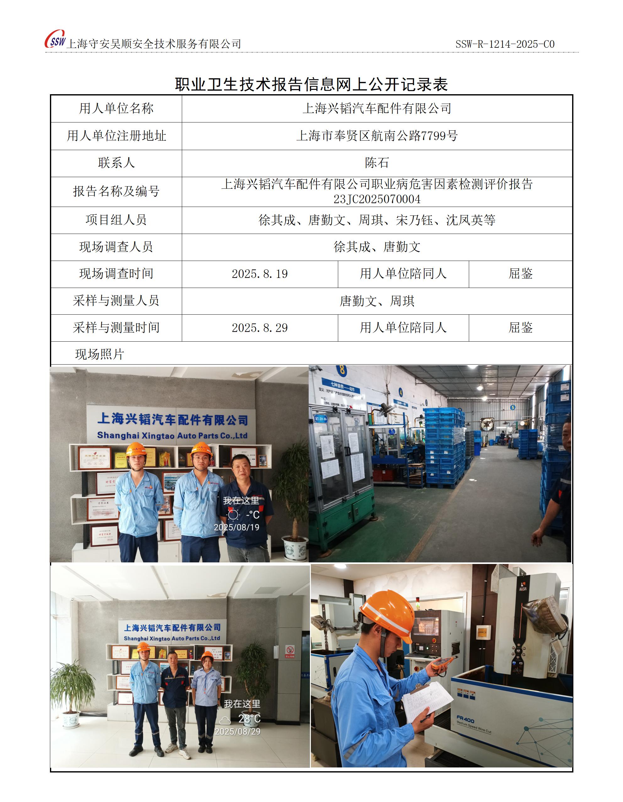 上海兴韬汽车配件有限公司职业病危害因素定期检测