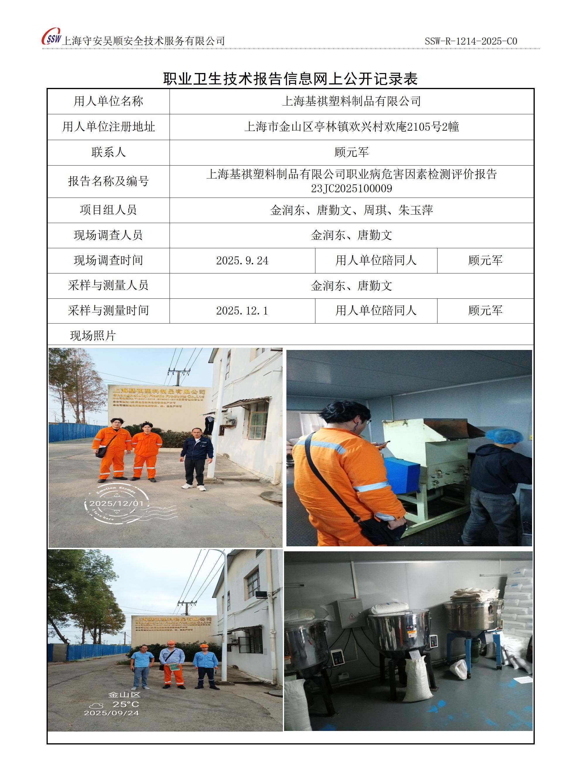 上海基祺塑料制品有限公司职业病危害因素定期检测